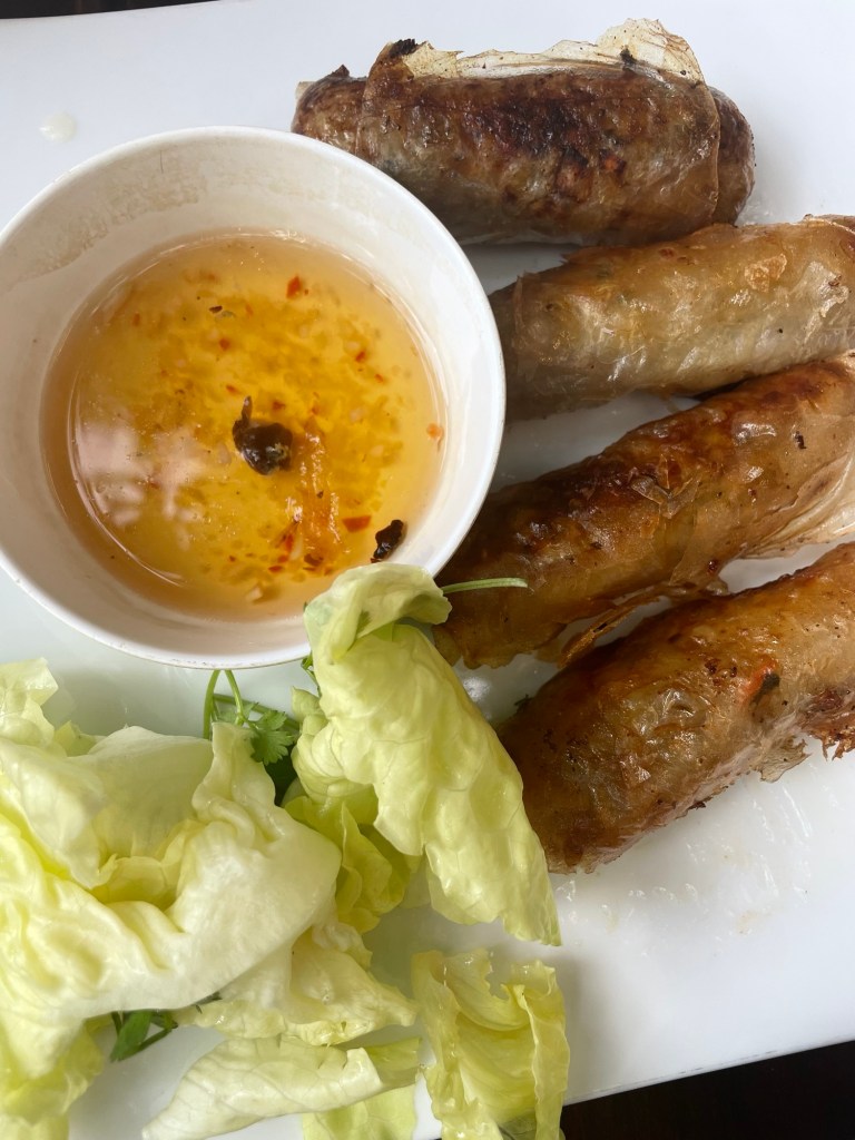 Le soir, nous dînons au Minh Khoi restaurant, qui fait de la nourriture asiatique classique. Nous essayons des sortes de rouleaux de printemps à la viande, des nems, et une sorte de bun cha. Nous allons faire nos affaires et nous couchons tôt car demain nous partons pour 2 jours de croisière dans la baie d’Halong !
