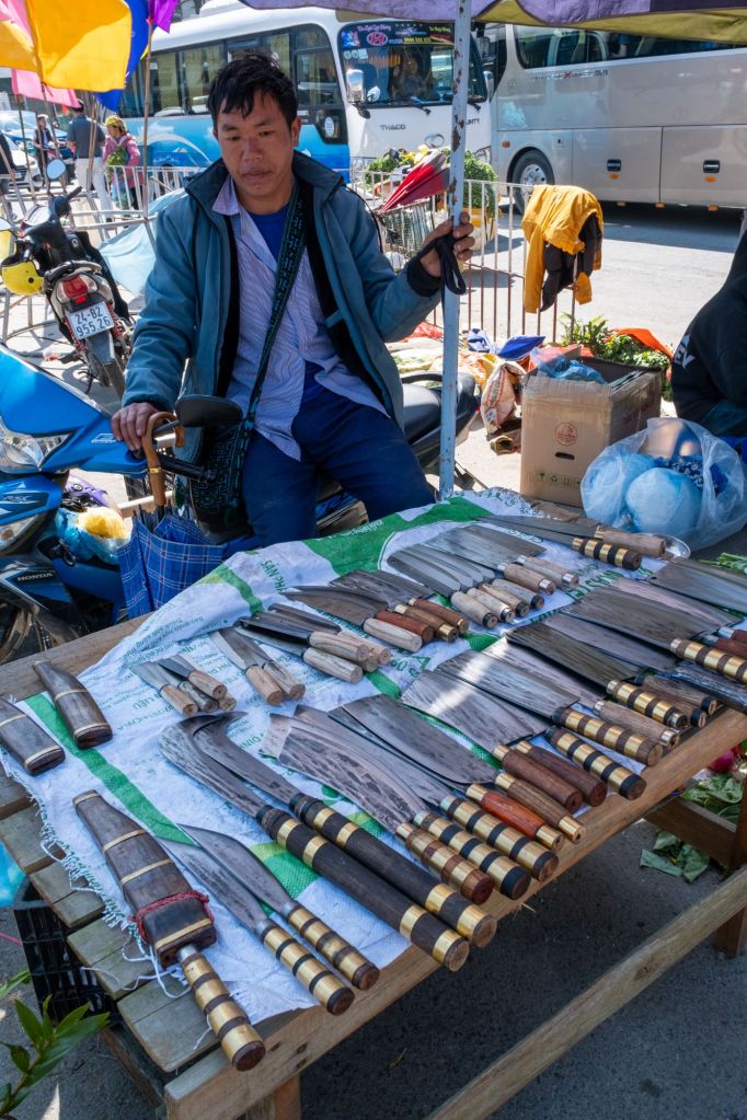 Après une bonne nuit dans le bus, nous arrivons à Sapa à 4h, avant le lever du soleil. Nous nous rendons à notre hôtel, et après avoir eu du mal à trouver le réceptionniste, il nous indique que toutes les chambres sont prises… Heureusement, il nous trouve un petit dortoir vide où nous allons terminer notre nuit. Nous nous réveillons difficilement en fin de matinée, et allons nous promener au marché de Sapa, car c’est dimanche, jour où il bat son plein. Entre les stands alimentaires qui vendent des fleurs de banane, des grosses noix de cajou et des gâteaux à la châtaigne, Guillaume avise un stand de couteaux. Comme ses parents vont pouvoir nous ramener des souvenirs en France, il ne se prive pas et en achète deux.