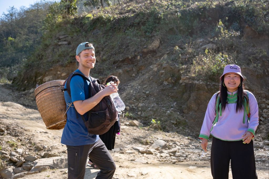La suite de la marche se poursuit en descente, la vallée est de plus en plus belle. sur le chemin, nous croisons un groupe de vietnamiens en train de pique-niquer, avec de drôles de bidons jaunes remplis de happy water (oui, ce même alcool de riz artisanal que dans tous les autres pays asiatiques, same same but different !). Ils nous ont invités à boire quelques shooters avec eux dans des bambous !