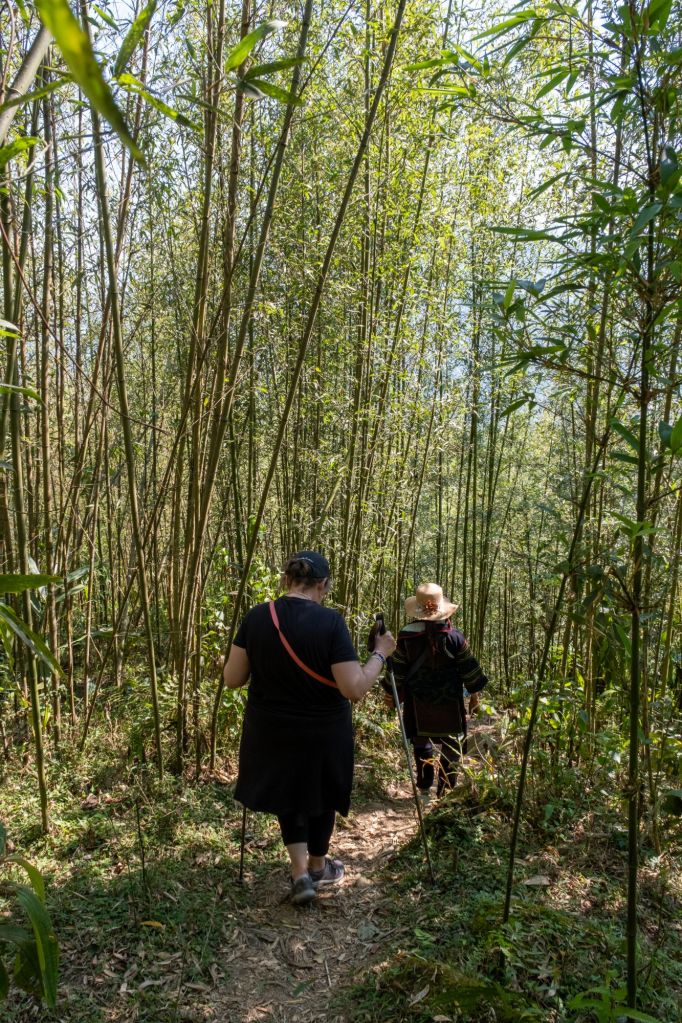 C’est une petite journée de marche, uniquement en descente, sur un petit sentier abrupt. La vue est toujours très jolie, nous passons entre les rizières puis à travers des forêts de bambous pour se rapprocher de la rivière qui coule en contrebas.