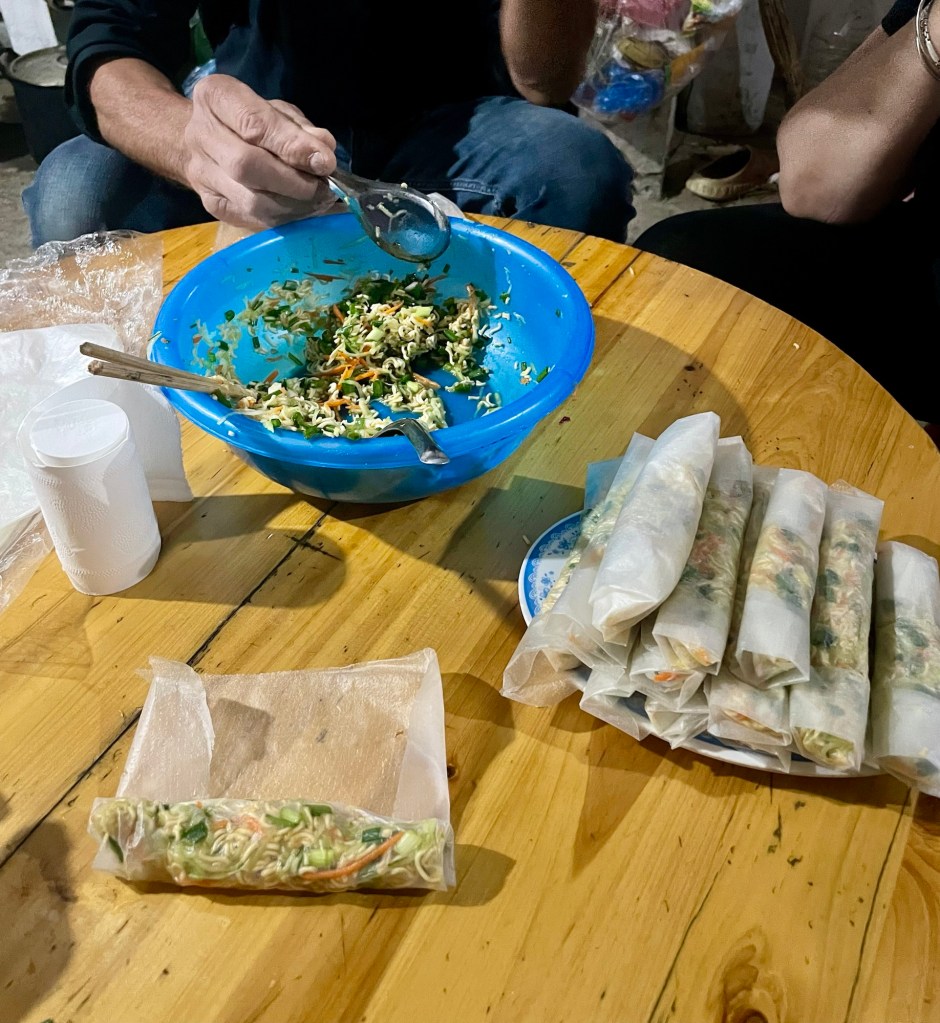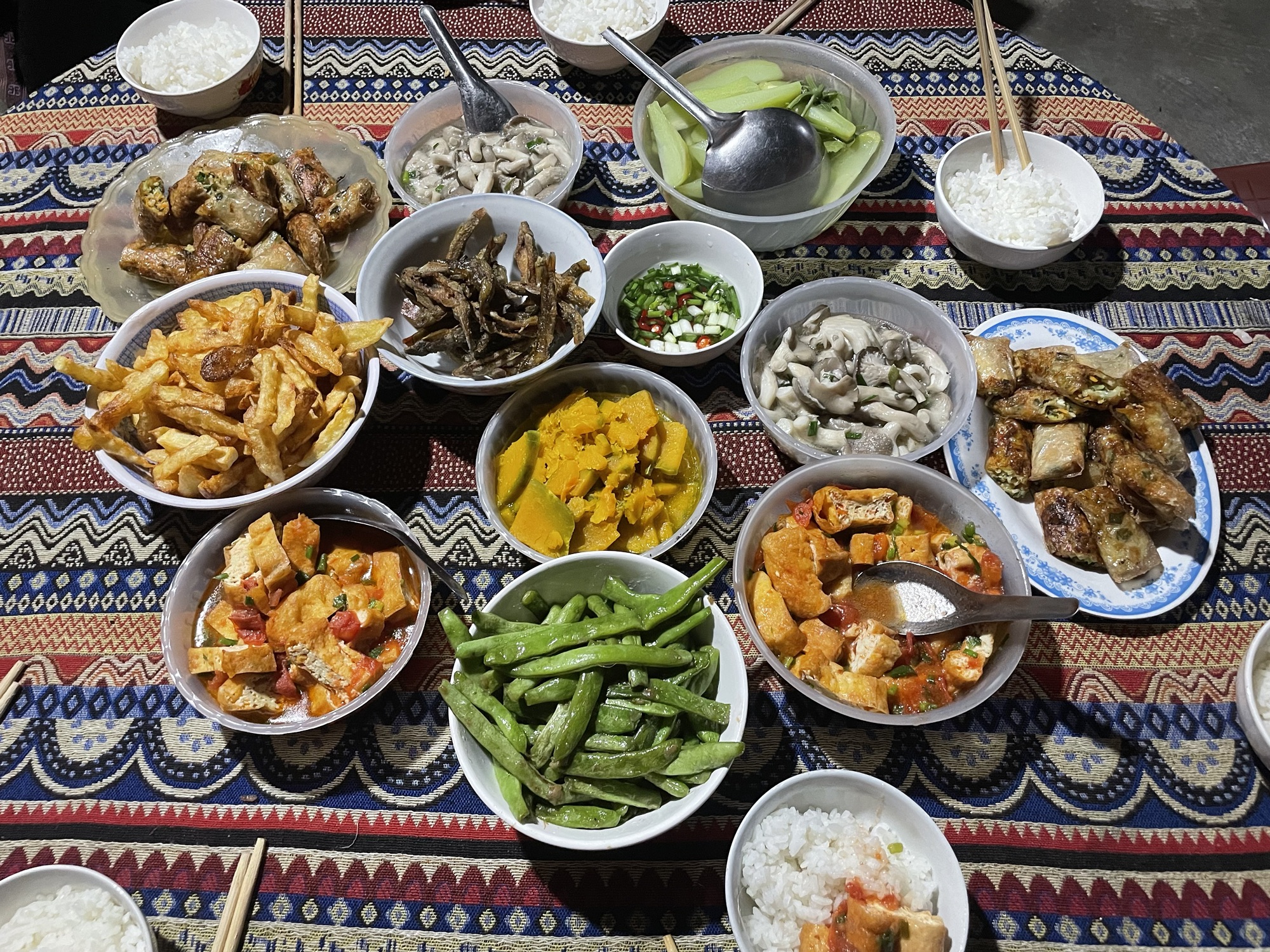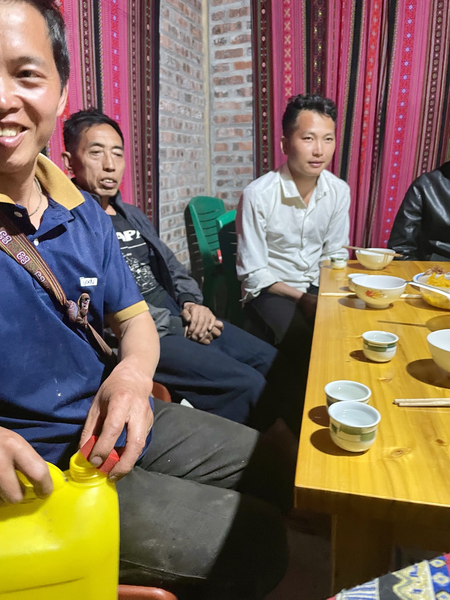 Nous sommes fourbus et partons faire une petite sieste en attendant l’heure du repas du soir. Je sens que je commence à être malade, j’ai de grosses crampes abdominales (coucou le petit bun cha du boui boui de ce matin), ça promet pour la suite du trek… Au lever de la sieste je ne me sens pas mieux, je vais donc malheureusement faire l’impasse sur le repas du soir. Ça a l’air pourtant délicieux ! Et tout est accompagné de happy water évidemment. Guillaume est venu se coucher un peu tard et légèrement éméché, c’est décidément fort cet alcool de riz !