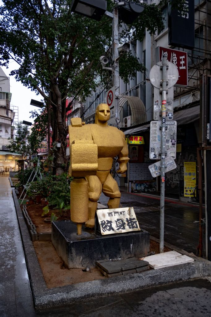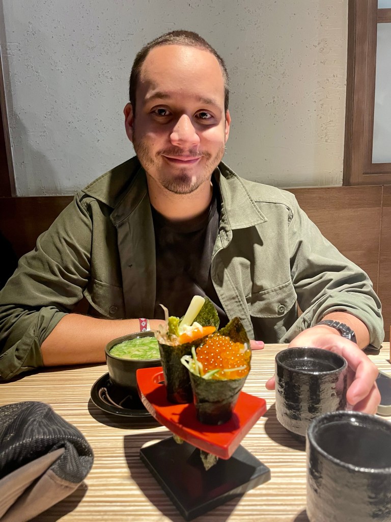 Nous partons en quête d’un endroit pour déjeuner dans le quartier, mais il est 14h et beaucoup de restaurants sont fermés. Nous trouvons de la place chez 魚兵衛太春和食處, un restaurant japonais. Ils ont heureusement un menu en anglais, c’est bien plus facile ! Nous prenons des temakis (un crevette-asperge et l’autre aux œufs de saumon), ainsi qu’un porc tonkatsu avec du riz. La soupe miso et le thé sont à volonté, et tout était très bon.