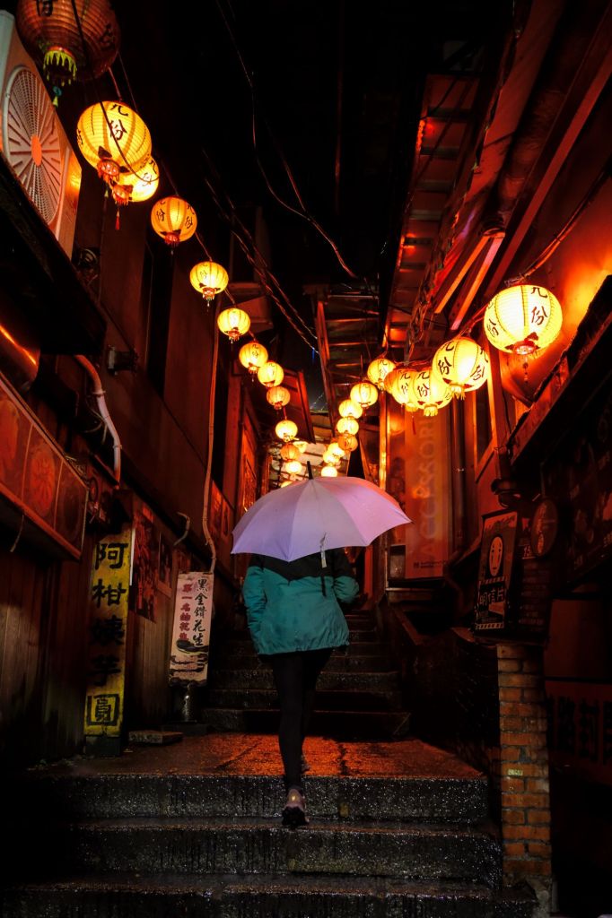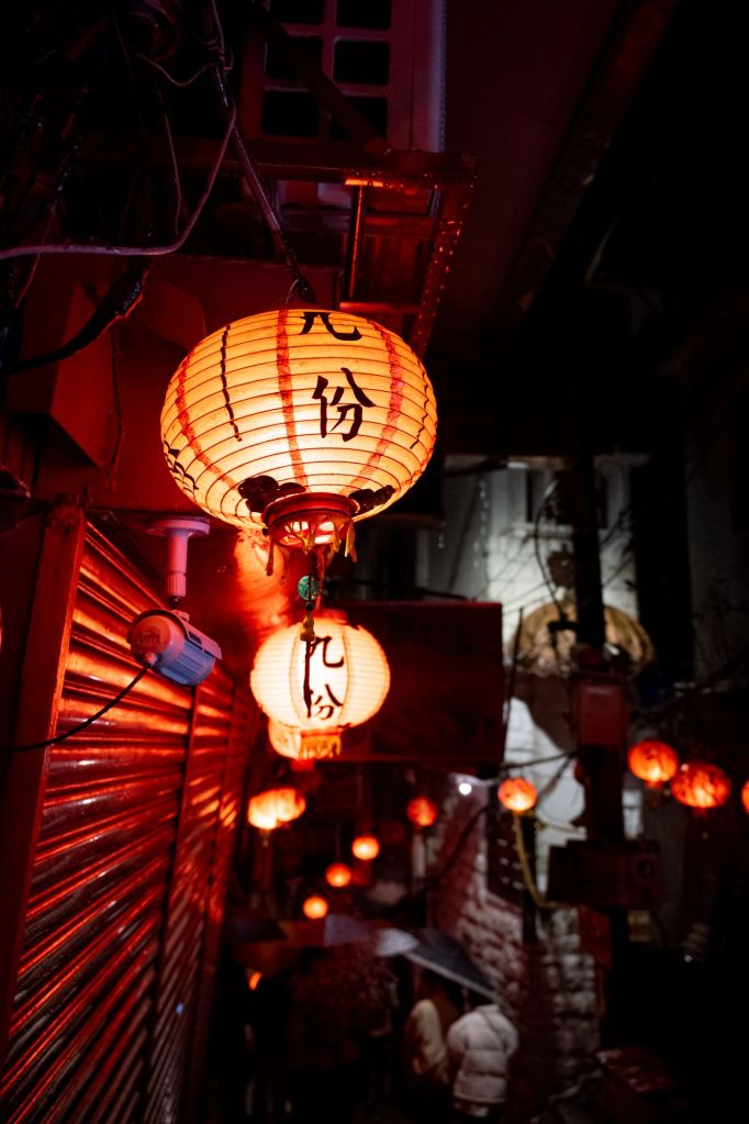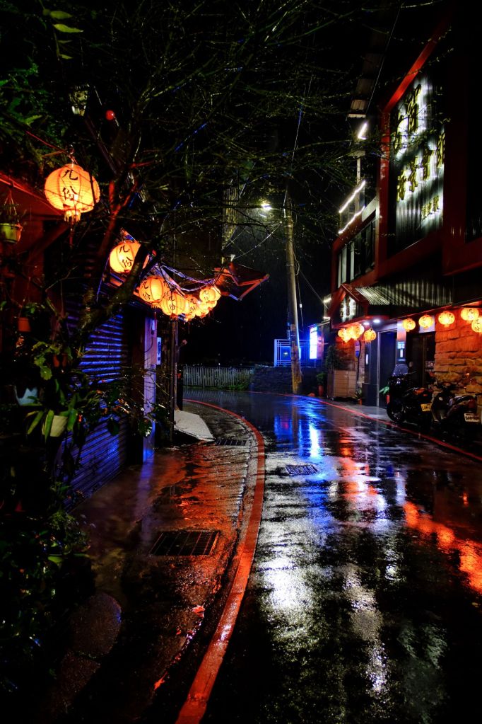 Nous arrivons sur la côte pacifique et tentons d’aller au Yehliu Geopark. Mais c’est maintenant le déluge et tout le monde court sous sa cape de pluie. Le parc avait l’air très beau mais tout est en extérieur, nous laissons donc tomber et poursuivons jusqu’à Jiufen, notre ville étape pour la nuit. C’est un petit village à flanc de montagne, très photogénique avec toutes ses lanternes. Il aurait inspiré Hayao Miyazaki pour le Voyage de Chihiro, et il est également très prisé des touristes asiatiques.
