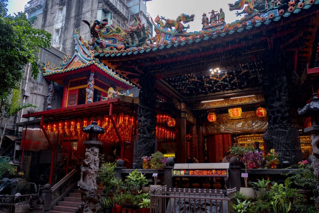 Un peu plus loin, nous nous rendons au Lungshan temple, un magnifique édifice bouddhiste orné de dragons et très coloré, niché entre les hauts buildings gris de la ville.