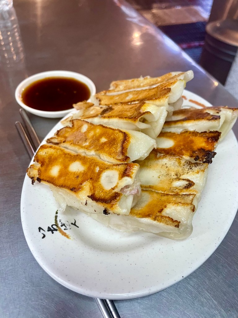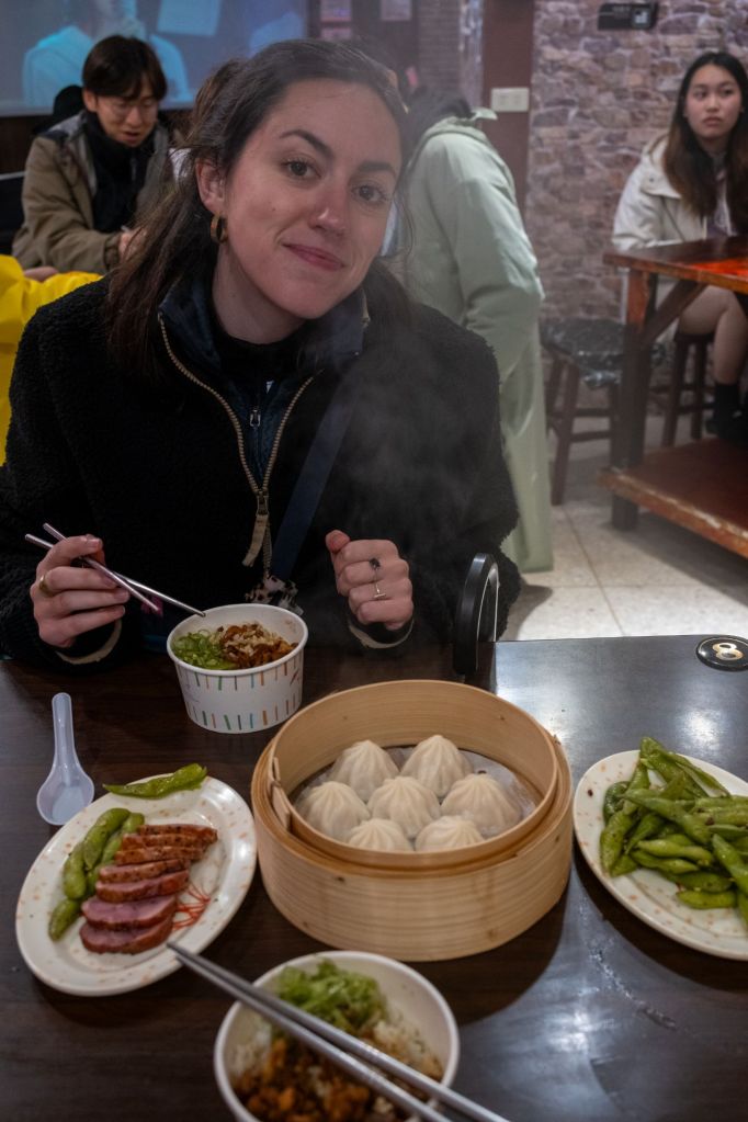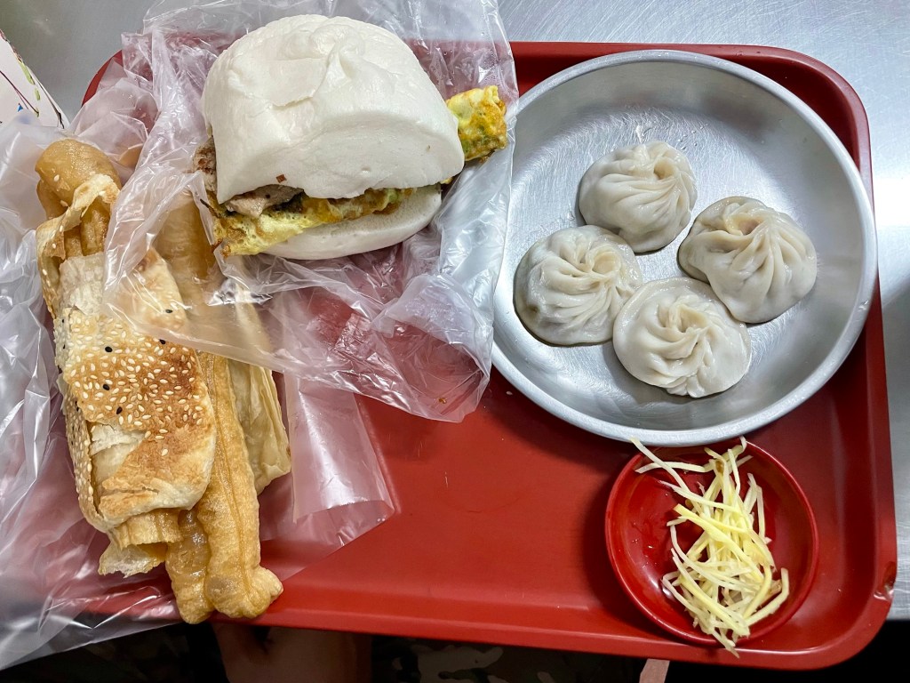 Ce matin, nous testons le petit-déjeuner taïwanais, chez Sihai Soy Milk (四海豆漿大王). Nous prenons des xiao long bao (sorte de petits dumplings délicieux), un bao à la viande et à l’omelette dans une petite brioche moelleuse, et des espèces de beignets taïwanais typique dans une sorte de galette. Le tout, accompagné de boissons au lait de soja sucré, un classique du petit-déjeuner.