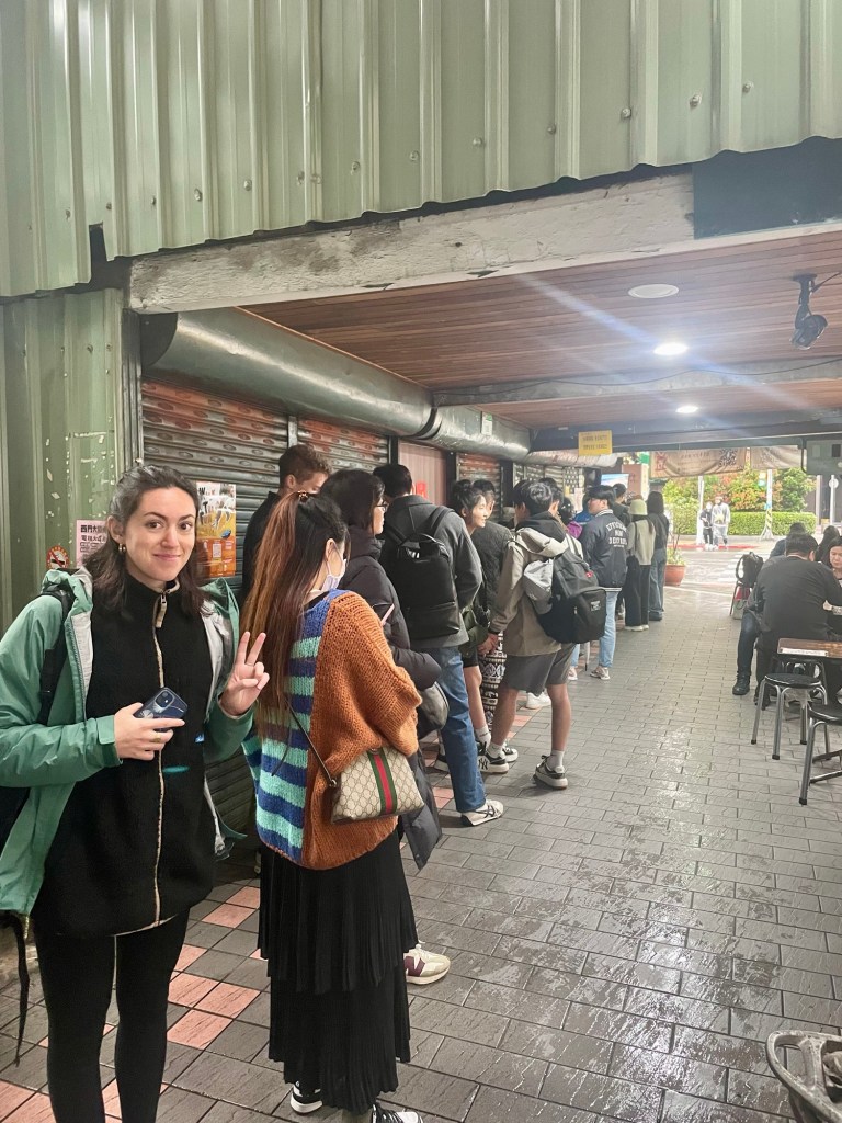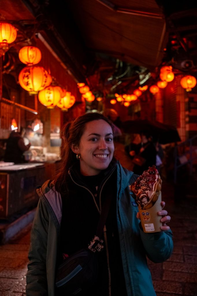 Pour terminer la soirée, nous allons dîner au night market de Ningxia. Taipei est connue pour sa street food, et nous ne sommes pas déçus. Il y a des dizaines de stands plus appétissants les uns que les autres. Comme tout est en chinois, je ne connais pas les noms, mais nous avons mangé : une sorte de beignet feuilleté fourré à la viande (délicieux), une crêpe fourrée aux pâtes au fromage et au poulet (très très bon), du porc croustillant (un régal), et une sorte de soupe avec des boules de tarot et des haricots rouges en dessert. Pour le moment, nous adorons l’ambiance de la ville et la nourriture !