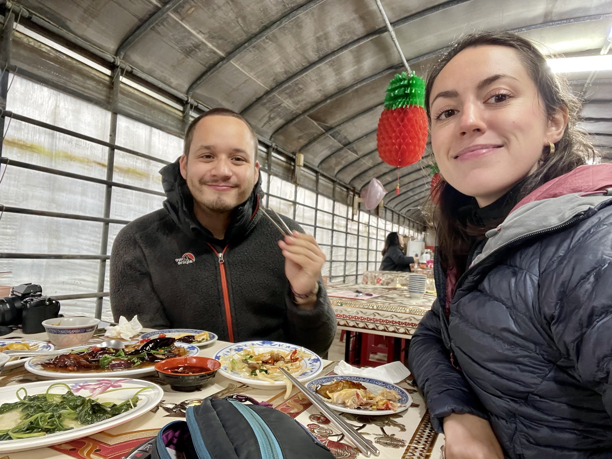 Puis nous grimpons une petite route de montagne qui nous emmène au parc Yangmingshan, que j’avais très envie de voir pour ses cerisiers en fleurs et ses jolies randonnées. Malheureusement, il pleut à verse, nous continuons donc notre chemin. Nous nous arrêtons manger dans un petit restaurant sous une serre. Le menu est en chinois et nous ne comprenons rien, même avec Google Traduction.