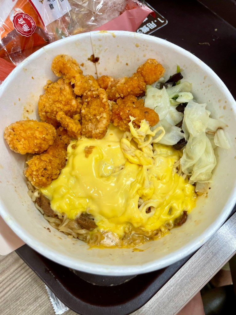 Nous sommes dimanche soir, il est tard et il fait déjà nuit, nous nous arrêtons en cours de route pour dîner dans un 7-eleven. Ces magasins appelés Konbini ou Convenience stores sont ouverts 24/7 et il y a tout ce dont on a besoin. En dehors d’y acheter à manger, les Konbini font office de petits supermarchés d’appoint mais on peut aussi y envoyer des lettres/colis, y payer ses factures de gaz, d’électricité ou ses amendes et ses impôts, y retirer de l’argent, acheter des billets de bus ou de train. Niveau nourriture, on y trouve de tout, des plats tout prêts aux soupes de nouilles, en passant par des onigiris et des gâteaux. Ce soir, nous dormons à Xincheng, petite ville au pied du parc national de Taroko, que nous irons visiter demain. Au programme : des montagnes, des canyons et de l’eau bleue.