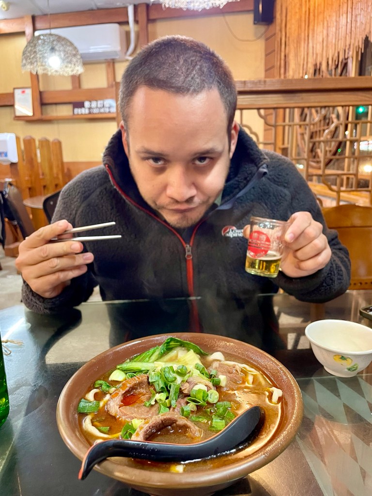 Il est l’heure de se diriger vers le nord afin de se rapprocher de Taipei, où nous rendrons la voiture demain. Après 4h de route, nous arrivons dans la banlieue de Taoyuan, où nous passerons la nuit au OLD WOW老屋瓦共享民宿. Les hôtes sont adorables, nous avons été très bien accueillis, et nous avons la chance d’avoir la petite maison pour nous seuls ! Sur leurs conseils, nous allons dîner au Zhong Li Xin Lao Pai Beef Noodles 中壢新老牌牛肉麵. Nous prenons une grande soupe de nouilles au bœuf, absolument délicieuse, ainsi que des dumplings (nous en avons même recommandé tellement c’était bon). Guillaume se prend une bière tandis que j’ai la bonne idée de commandé du jus de prune, qui s’avérera pas si délicieux mais surtout qui arrivera sous la forme d’une bouteille d’1L. En dessert, il y a des glaces dont on peut se servir gratuitement et à volonté !