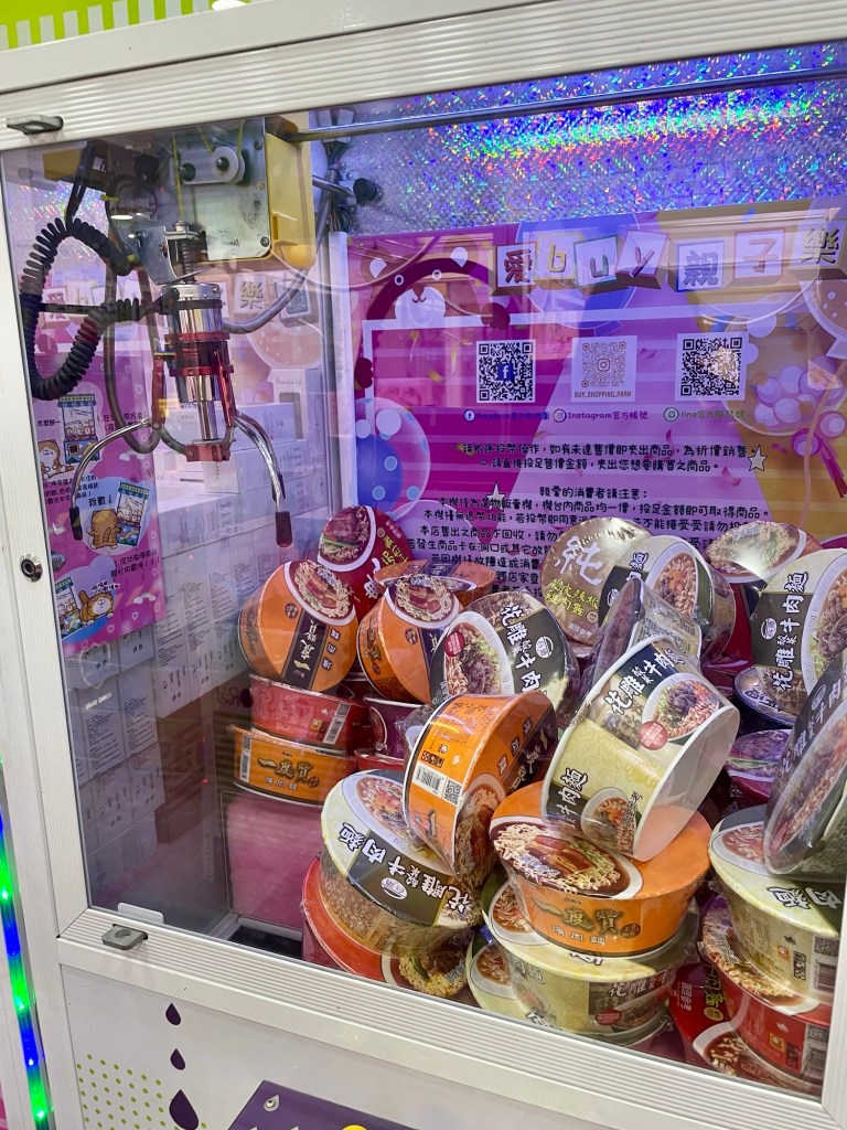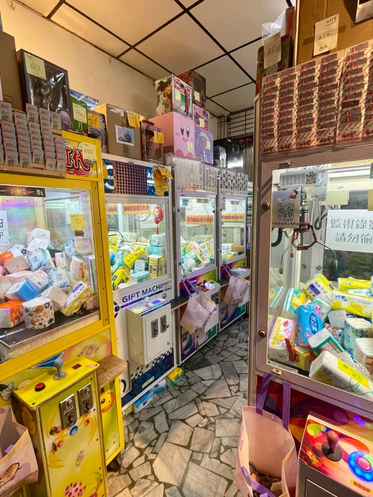 Après le petit déjeuner (thé, café et une délicieuse brioche), nous partons pour Taipei pour notre dernier jour. Nous retournons dans le quartier piéton de Shimenting que nous avions bien aimé, et nous promenons au milieu des boutiques à la recherche d’un porte-clé porc croustillant. Malheureusement, nous n’en avons vu que dans les machines à pinces et impossible de les attraper… Ces machines sont présentes à tous les coins de rue et très populaires, on y trouve de tout : des porte-clés à la lessive ou le sopalin, en passant par des machines à café ou des faux Ferrero Rocher.