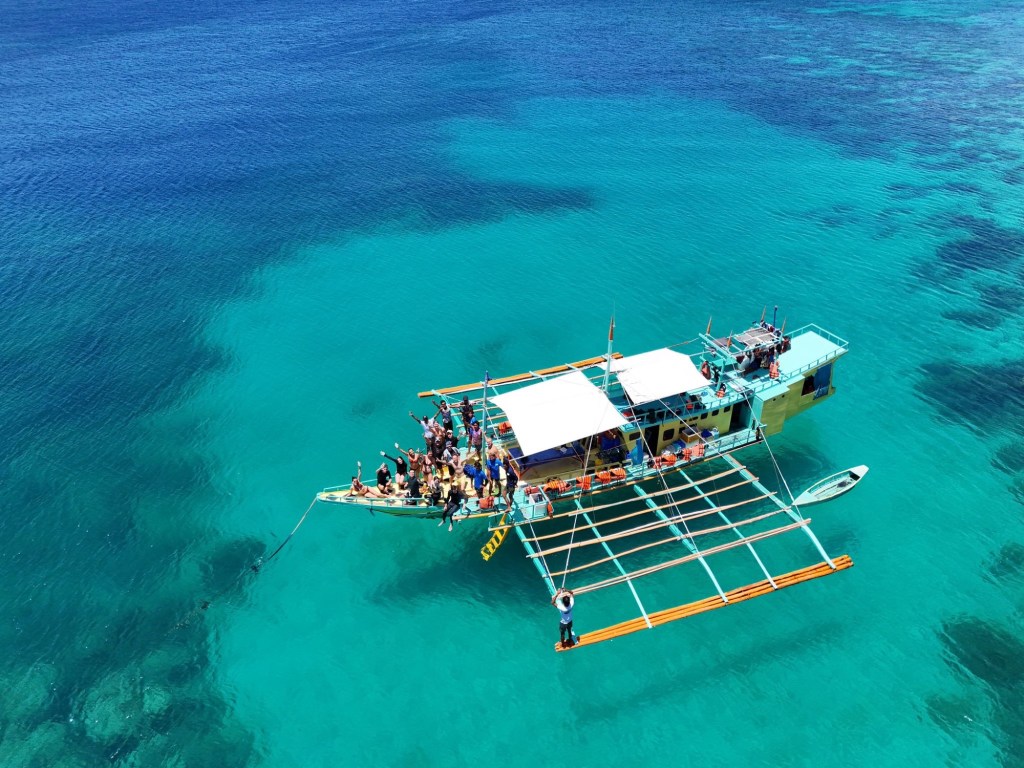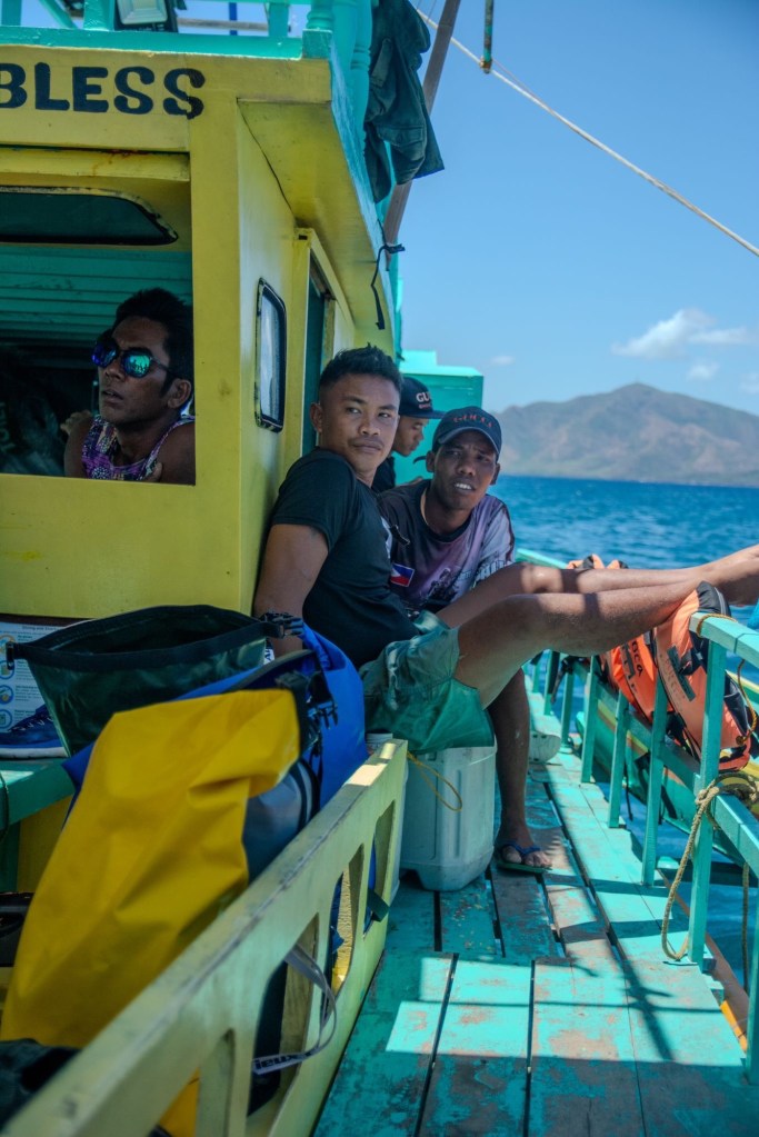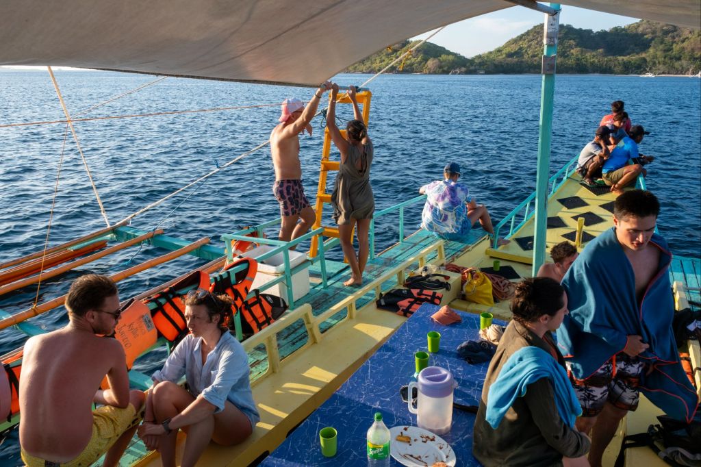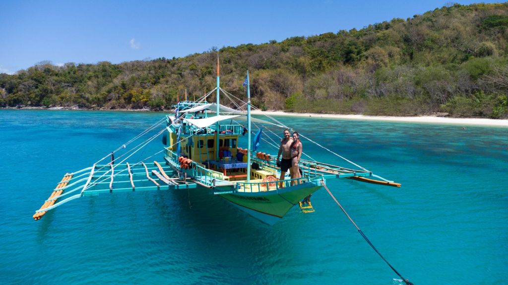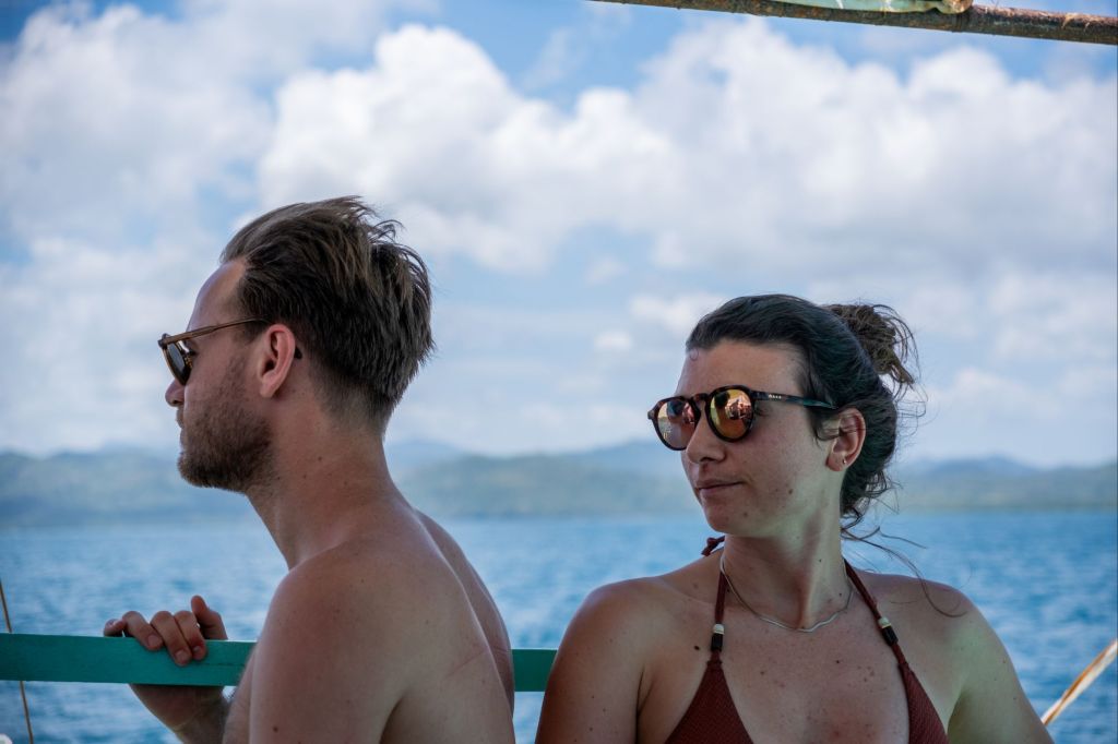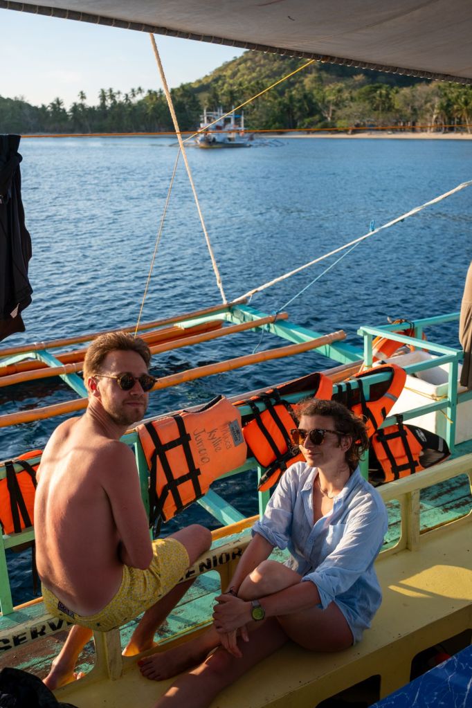 Départ pour 3 jours de croisière depuis El Nido jusqu’à Coron, à travers l’archipel des îles Linapacan. Nous nous rendons à l’office de Keelooma où nous sommes répartis entre deux bateaux. Avec nous 6, deux couples de français (Flora et Elie, et Marine et Kevin), un couple de néerlandais et un couple d’américains. Nous avons un bateau philippin typique, avec des flotteurs en bambous. À l’étage inférieur se trouve une grande table pour les repas, et à l’étage supérieur des matelas sont disposés à l’ombre d’une grande toile. Nos grands sacs sont dans la soute, et nous n’avons qu’un petit dry bag qui nous servira pour les 3 jours.