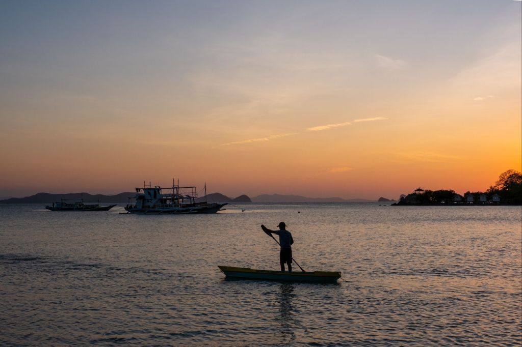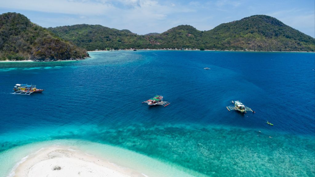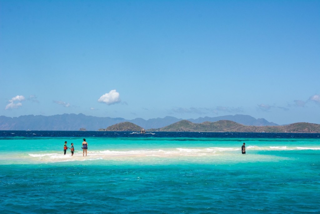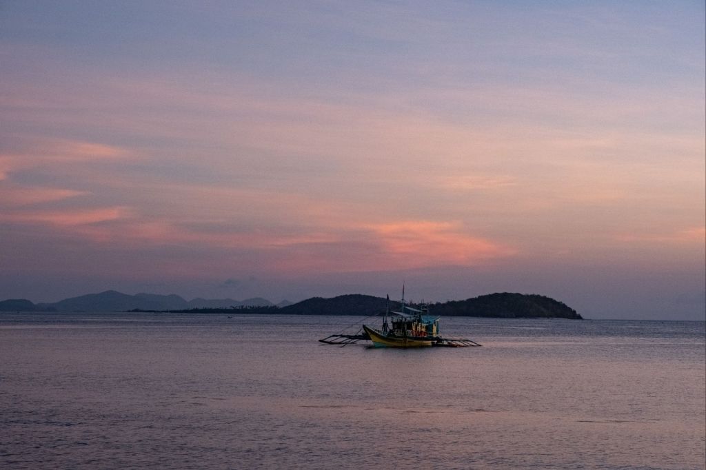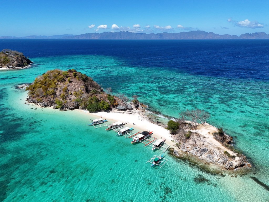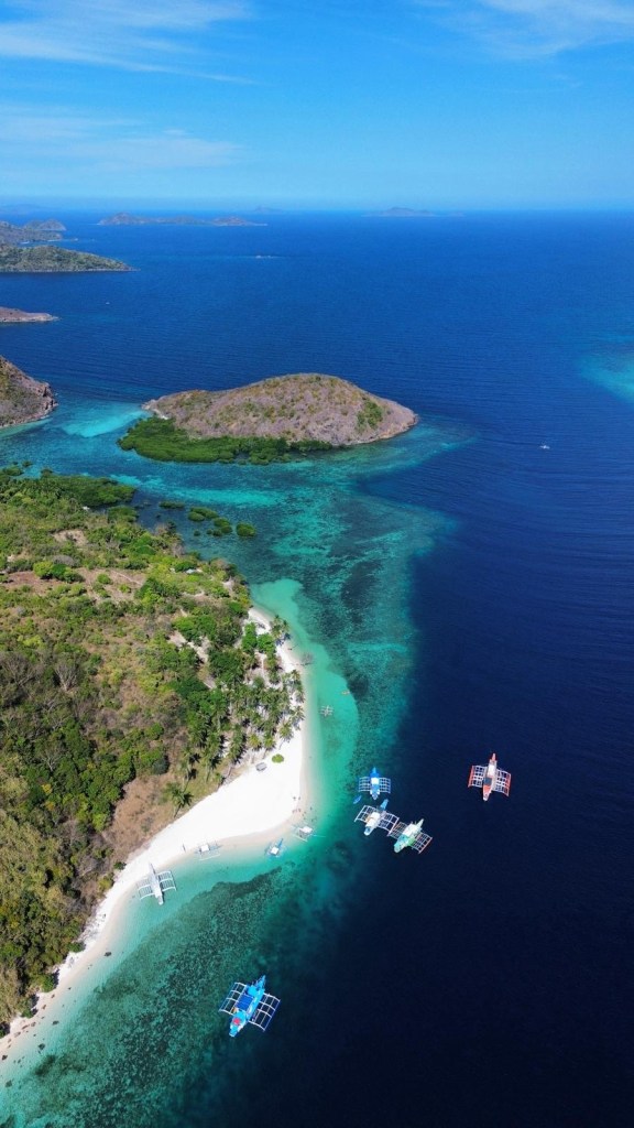 Départ pour 3 jours de croisière depuis El Nido jusqu’à Coron, à travers l’archipel des îles Linapacan. Nous nous rendons à l’office de Keelooma où nous sommes répartis entre deux bateaux. Avec nous 6, deux couples de français (Flora et Elie, et Marine et Kevin), un couple de néerlandais et un couple d’américains. Nous avons un bateau philippin typique, avec des flotteurs en bambous. À l’étage inférieur se trouve une grande table pour les repas, et à l’étage supérieur des matelas sont disposés à l’ombre d’une grande toile. Nos grands sacs sont dans la soute, et nous n’avons qu’un petit dry bag qui nous servira pour les 3 jours.
