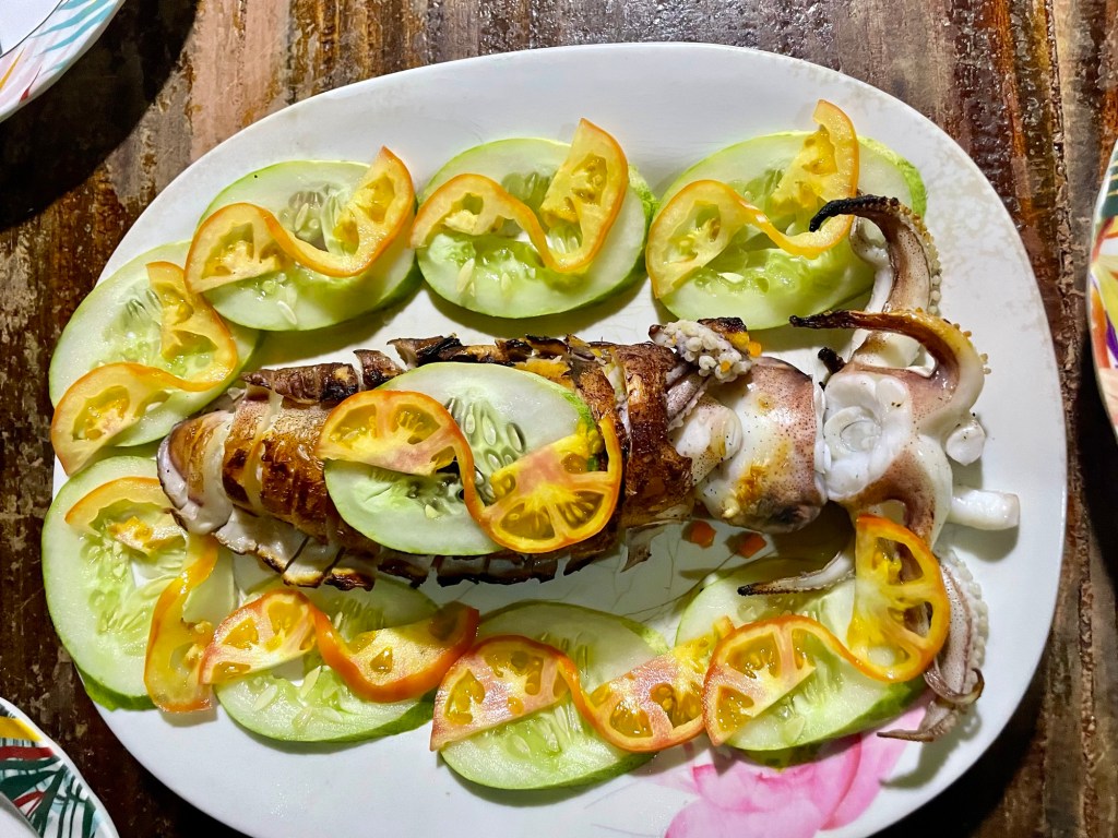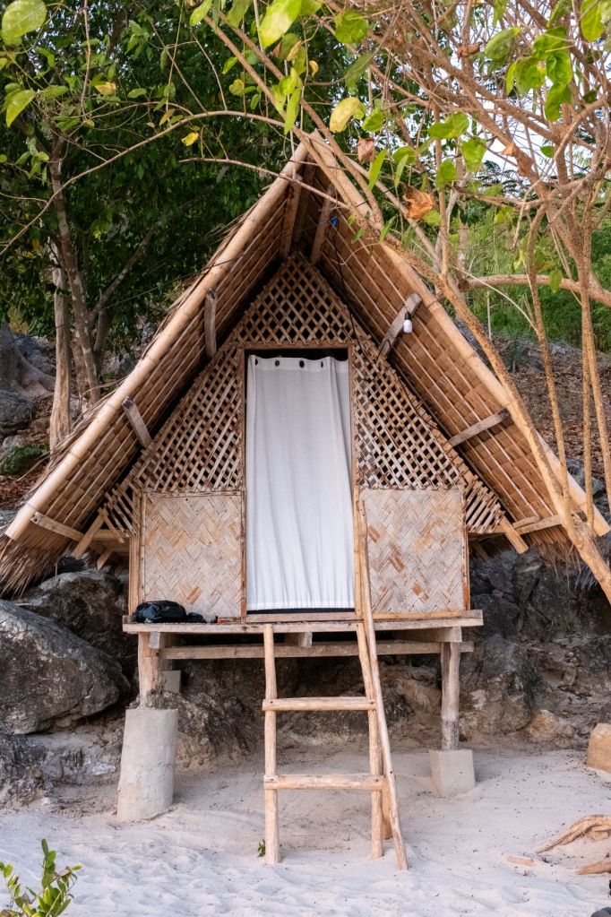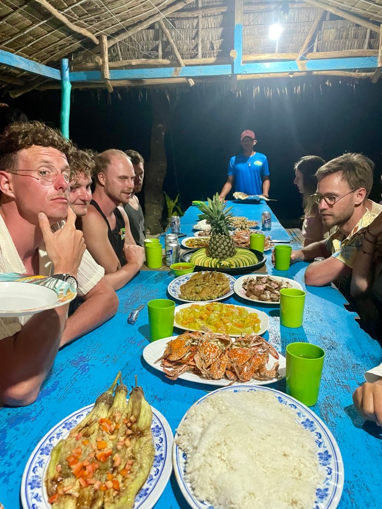 Nous avons juste pour nous une jolie plage avec des petites cabanes (bahay kubos) avec vue sur la mer, des douches extérieures et une grande table pour le dîner. Le repas est encore gargantuesque : poisson grillé, viandes, crabes, légumes en curry, aubergines grillées, riz, et des fruits en dessert.