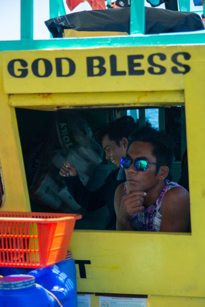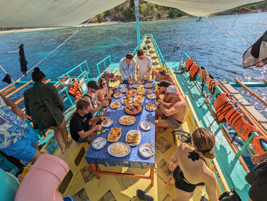 Nous quittons notre île à la nage pour rejoindre notre bateau. Après un délicieux petit déjeuner (pancakes, œufs, saucisses, riz et fruits), nous partons pour une nouvelle journée sur l’eau.
