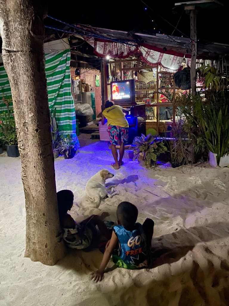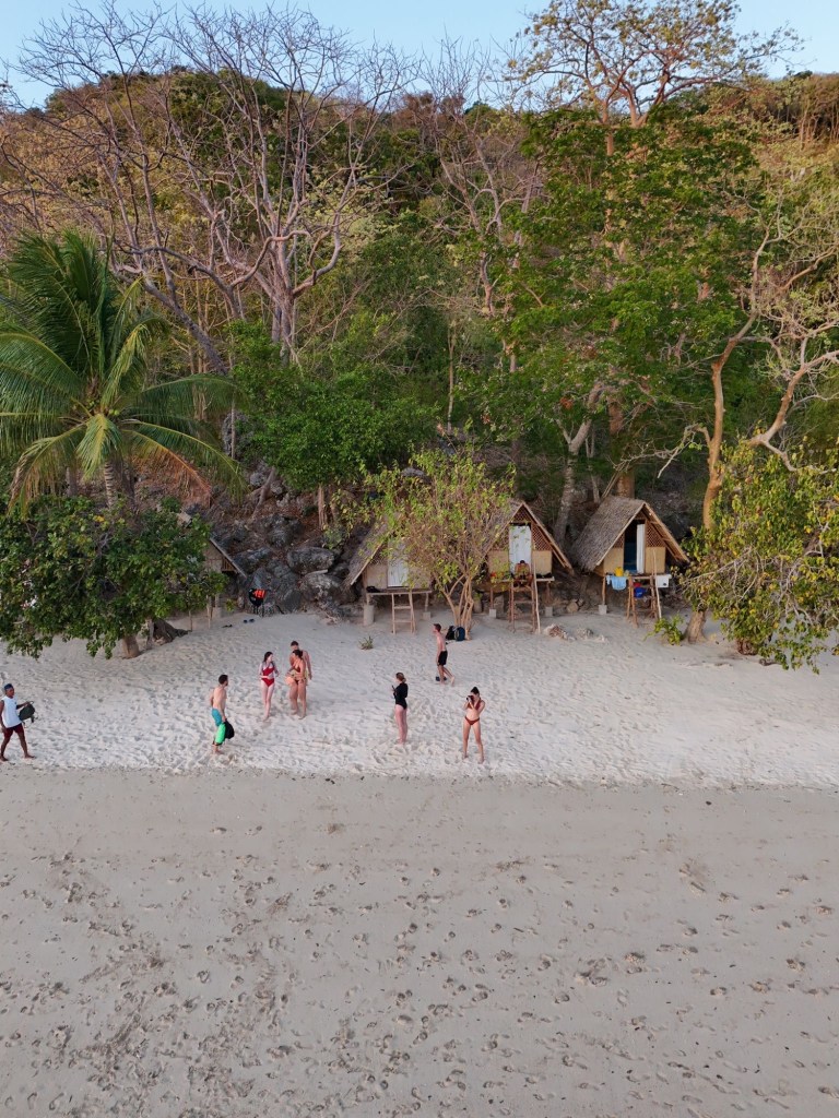 Notre île pour ce soir est un peu plus peuplée que la précédente : il y a déjà un autre groupe arrivé avant nous, ainsi que quelques familles de philippins qui habitent ici. Nous dormons toujours dans des petites cases pointues au toit en feuilles de palmier, sur la plage, face à l’eau. Après une partie de beach volley pour les hommes, puis une petite bière sur la plage devant le coucher de soleil, nous nous attablons pour notre dernier dîner. C’est un régal : calamar grillé, poisson, curry de légumes, poulet inasal, et de l’ananas et de la pastèque en dessert.
