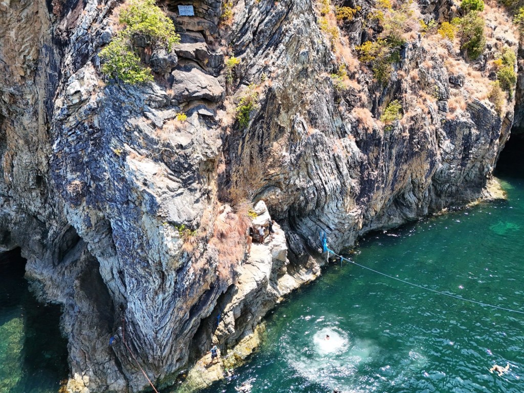 La première étape de la journée est une falaise depuis laquelle on peut sauter dans l’eau, ainsi qu’une petite grotte à demi-immergée.