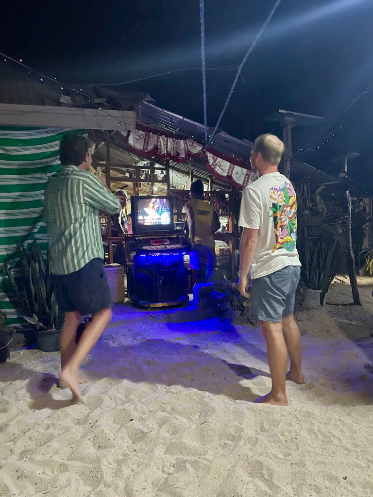 Puis notre guide nous annonce le clou de la soirée : un karaoke ! Ils nous sortent un appareil à karaoke vintage comme on ne trouve qu’en Asie (un catalogue de plusieurs milliers de chansons, les paroles défilant sur des vidéos de défilés Victoria’s Secret), et démarrent le groupe électrogène spécialement pour l’occasion. Après quelques coupures répétées, nous avons pu chanter quelques chansons et mettre l’ambiance sur l’île, l’autre groupe est même venu se rejoindre à nous.