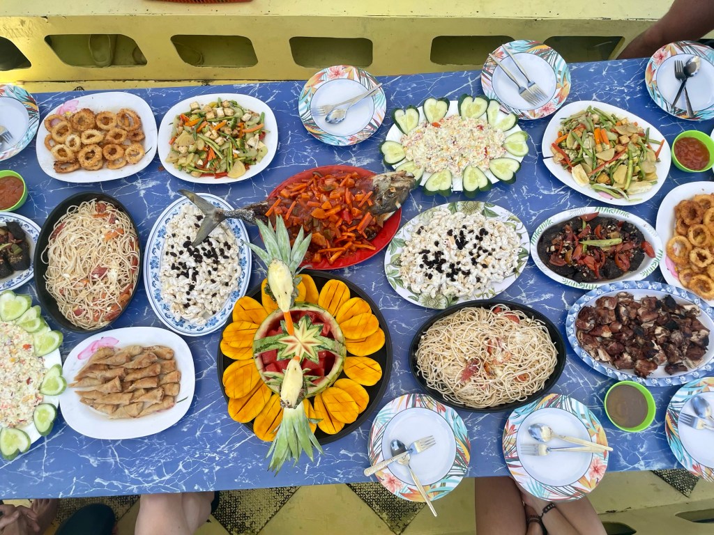 Puis c’est l’heure du premier repas sur le bateau, et nous ne sommes pas déçus ! Il y en a pour tous les goûts : porc, crevettes, moules, légumes, pâtes et riz, nous nous régalons.