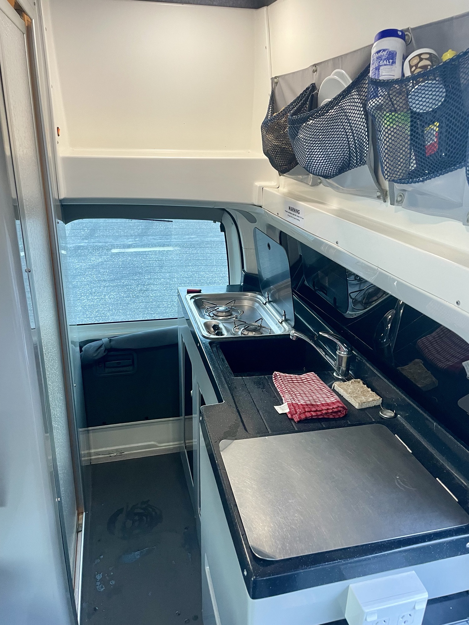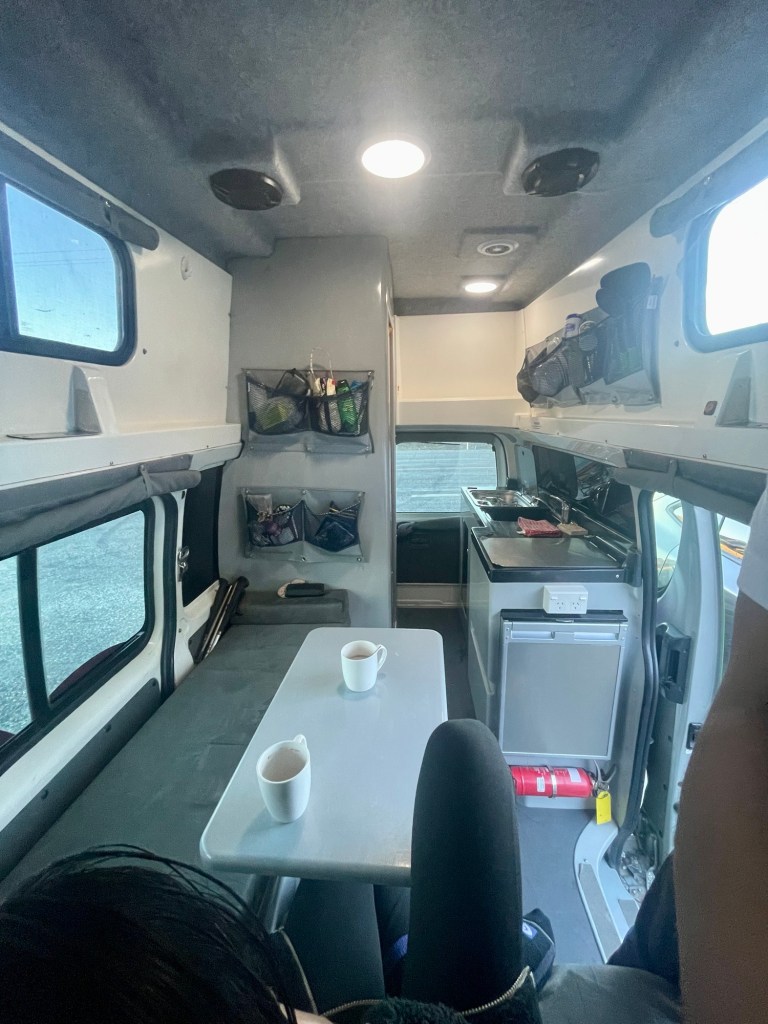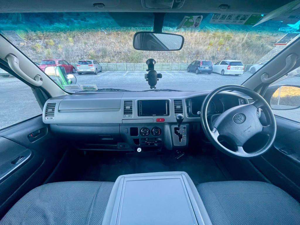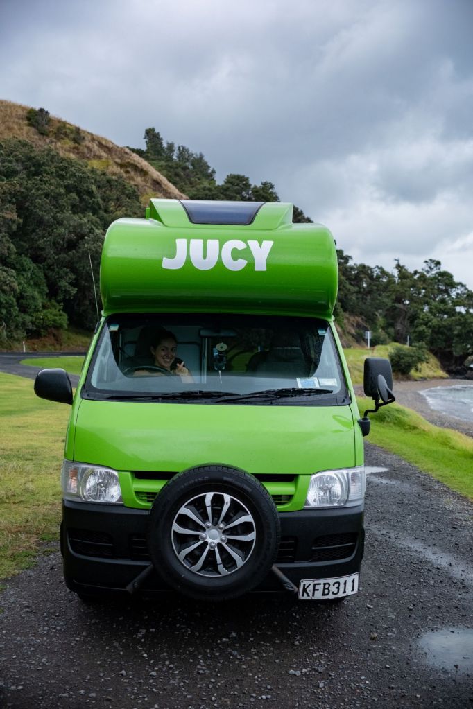 Après 3 jours de voyage, une nuit dans le ferry, une nuit dans l’avion et une nuit dans notre petit hôtel miteux près de l’aéroport d’Auckland, nous commençons notre périple en Nouvelle-Zélande. Ce matin, nous allons récupérer notre van chez Jucy, un magnifique Toyota Hiace (la meilleure marque de voiture). Nous avons pris un grand modèle avec lit au-dessus de la cabine de conduite, ce qui nous permettra de ne pas devoir refaire le lit chaque soir. C’est le luxe, le van est très bien agencé, et nous avons même une douche et des toilettes ! À l’agence, il y a un grand placard où les voyageurs déposent ce qui leur reste de nourriture ou de produits ménagers et nous faisons nos petites courses avant de partir (pâtes à foison, liquide vaisselle, éponge, sauce piquante, etc).