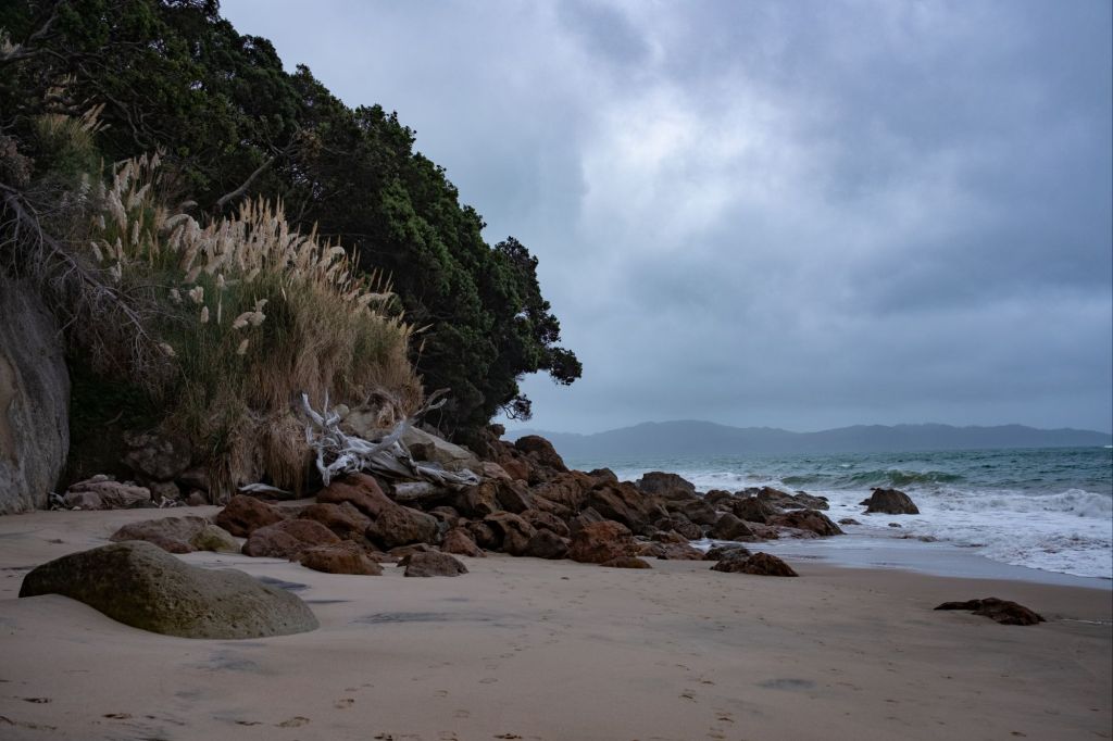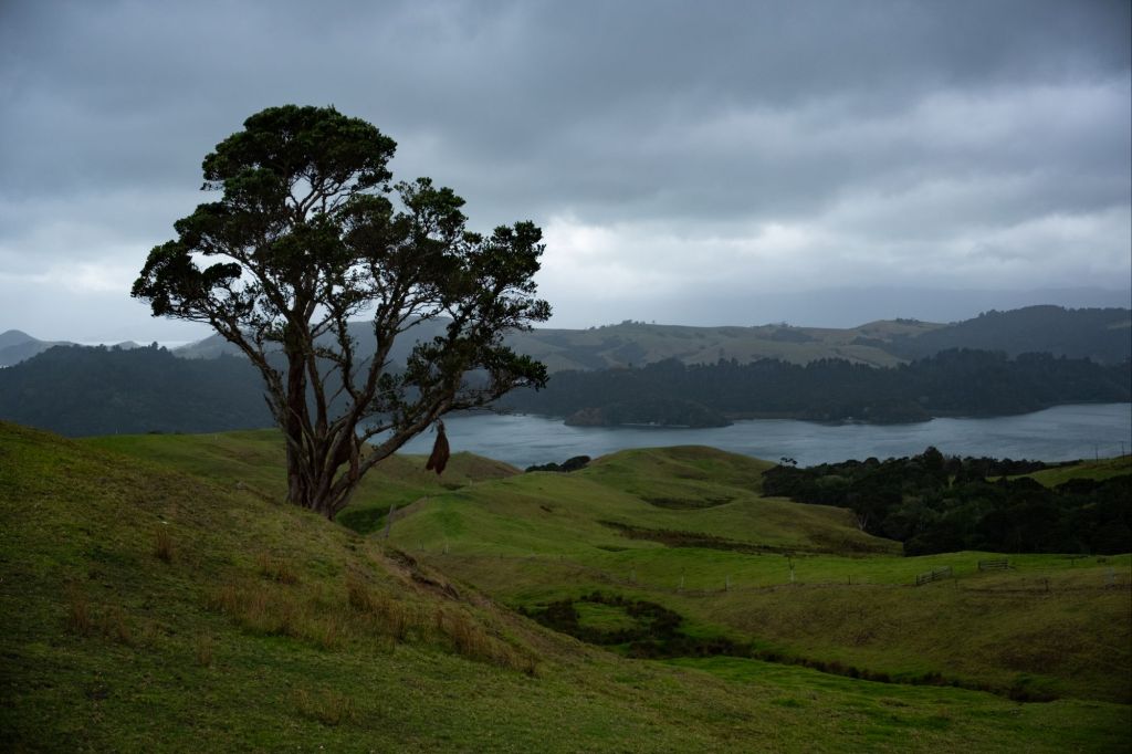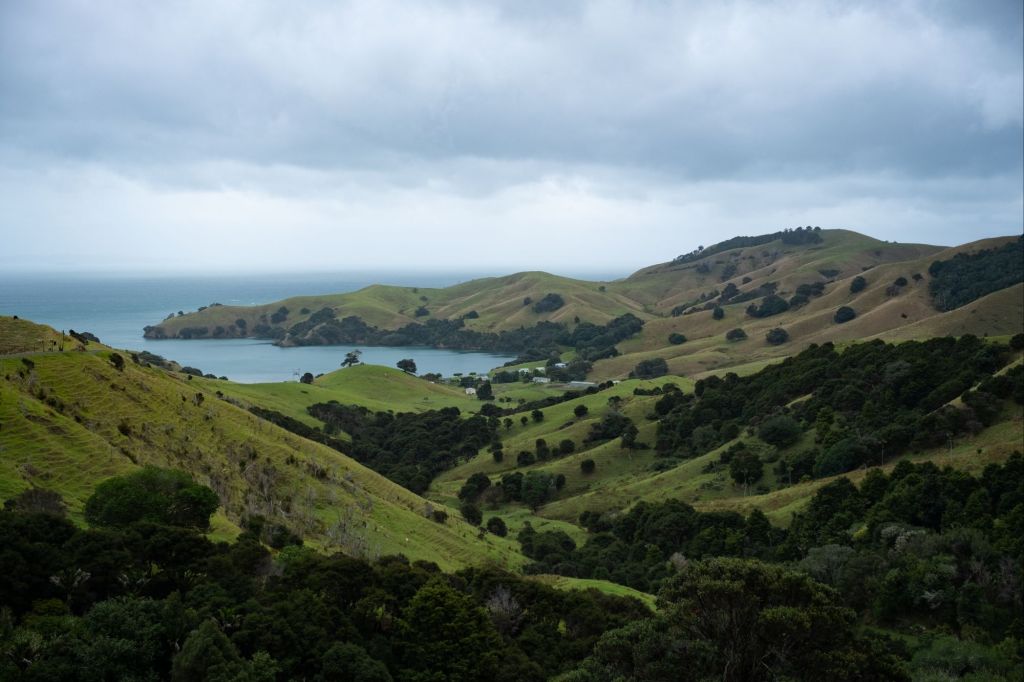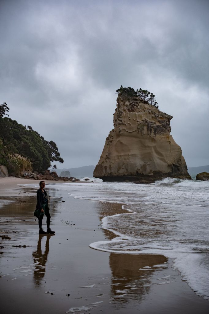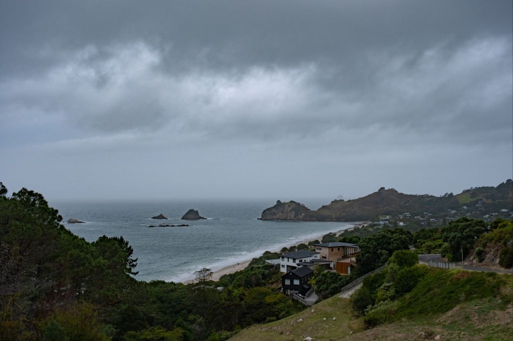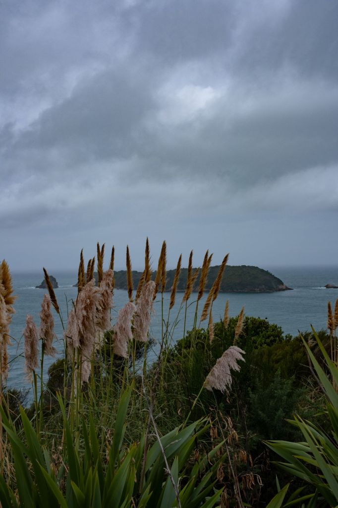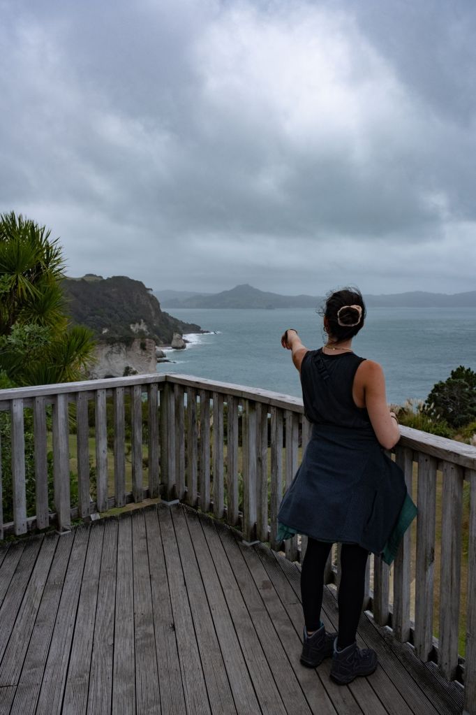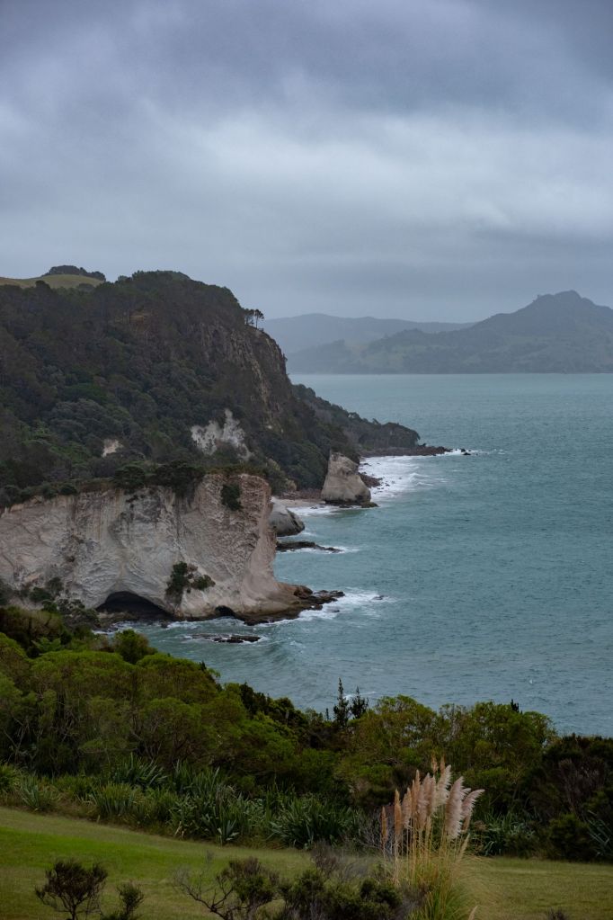 Ce matin, réveil matinal car il faut partir avant 9h de l’emplacement. Nous testons la douche du van qui fonctionne très bien (nous avons même de l’eau chaude !). Après le petit déjeuner, nous partons explorer la péninsule de Coromandel. Le temps est partagé entre une fine pluie et quelques éclaircies, le paysage se dévoile au fur et à mesure de notre route. Il ressemble à l’Irlande par endroit, avec de l’herbe verte, et des roches noires se jetant dans la mer grise.