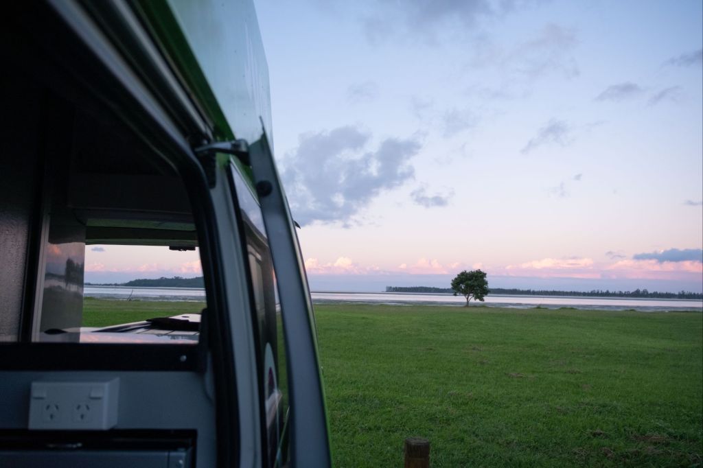 Nous profitons d’un joli coucher de soleil sur la mer, depuis le van.
