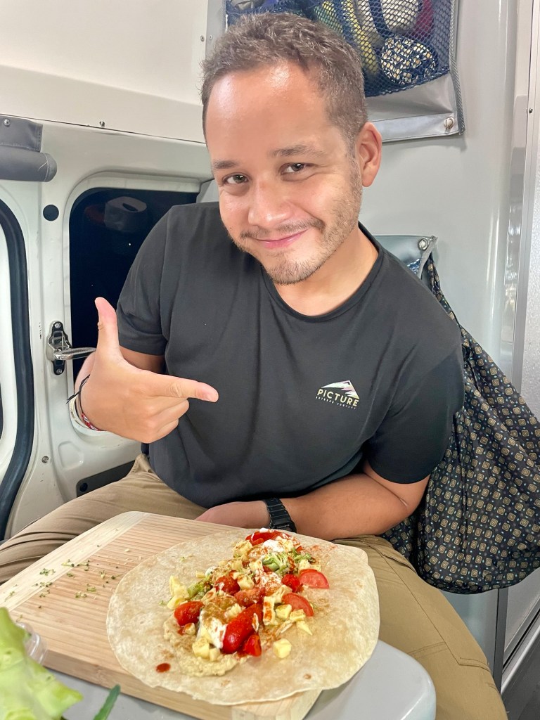 Notre route longe toute la côte, et nous nous arrêtons déjeuner au bord d’une plage, à l’abri dans notre van. Au menu : wraps houmous, poivrons, tomates, brocolis, fromage. Après une courte promenade sur la plage, nous reprenons la route en direction de l’est de la péninsule.