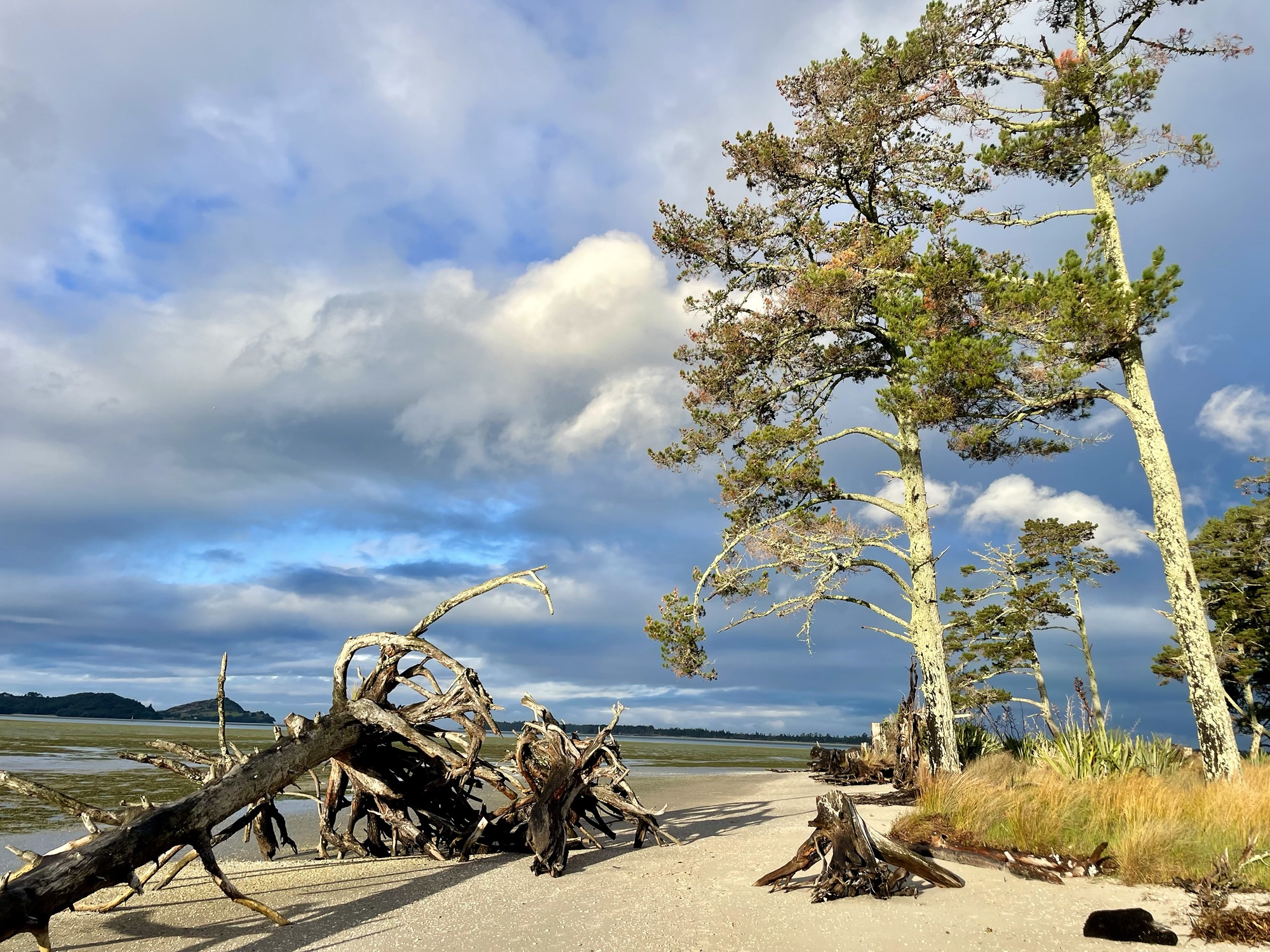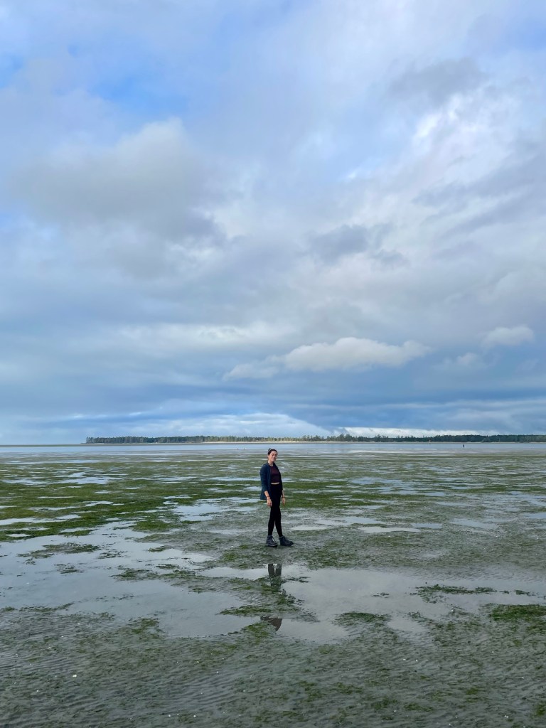 Le temps se lève en fin d’après-midi, et nous en profitons pour faire le tour de la petite pointe où nous sommes garés. Il y a une jolie petite forêt au centre, et nous marchons sur la plage de sable gris qui fait le tour de la pointe. La marée est basse, et quelques pêcheurs à la ligne tentent leur chance les pieds dans l’eau.