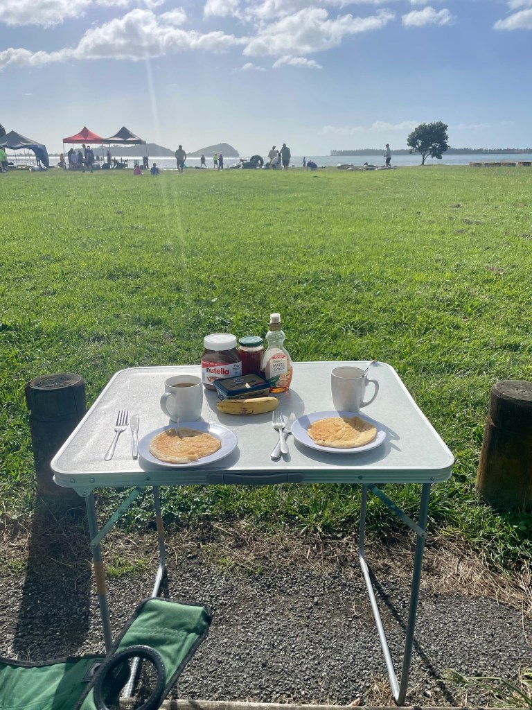 Nous sommes réveillés par de l’agitation sur le parking. Une foule de néo-zélandais arrivent, leurs 4×4 chargés de jeux divers, de bottes de foin et de chambres à air. Il fait beau, nous décidons de bruncher au soleil sur la pelouse en regardant l’installation de cette espèce de kermesse devant nous.