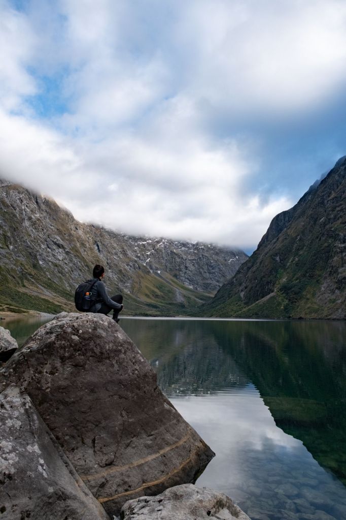Après une petite montée courte mais intense, nous arrivons au lac. Il est magnifique, entièrement entouré de montagnes de tous les côtés. Sa surface est si lisse qu’elle reflète le paysage alentour.