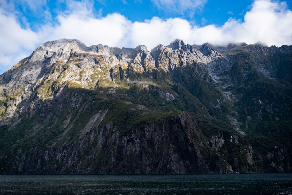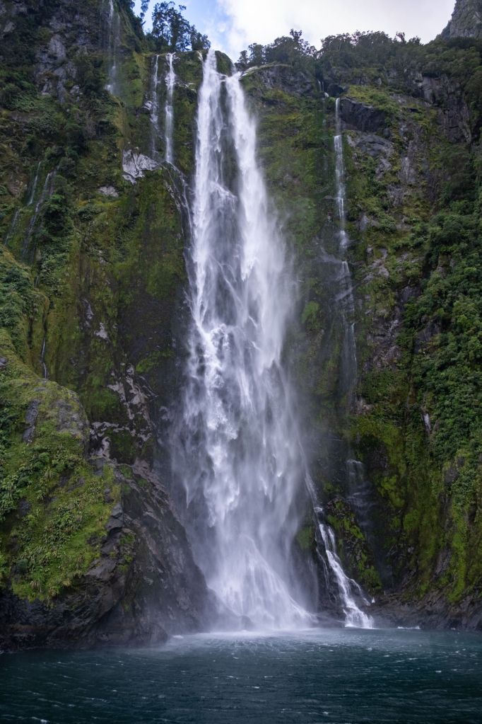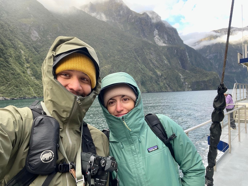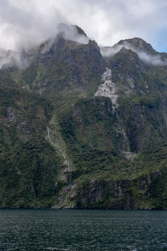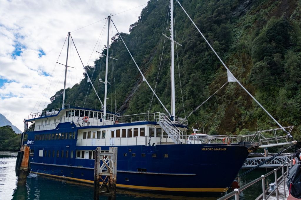 Nous avons réservé notre croisière avec RealNZ, sur un gros bateau à l’allure de voilier. Nous nous installons sur le pont supérieur pour avoir la meilleure vue, et partons pour 2h de croisière dans le fjord. Le trajet est vraiment beau, nous sommes entourés de hautes montagnes verdoyantes, avec de nombreuses cascades qui coulent sur leurs flancs jusqu’à l’eau.