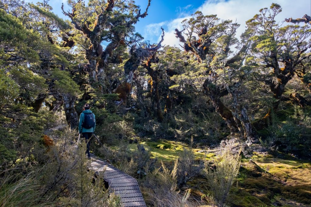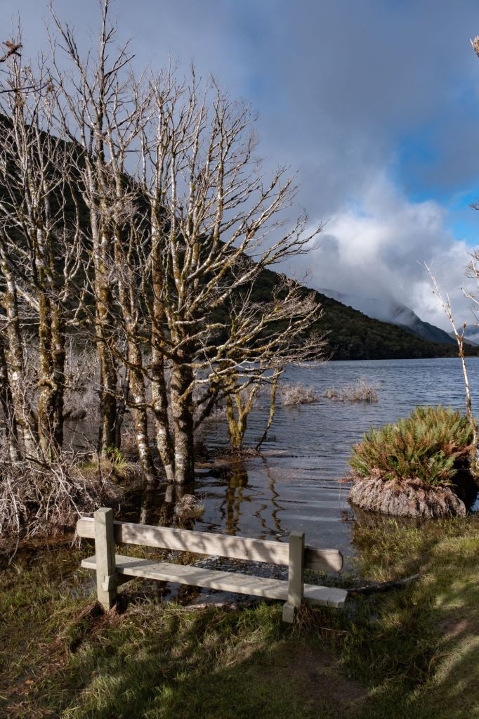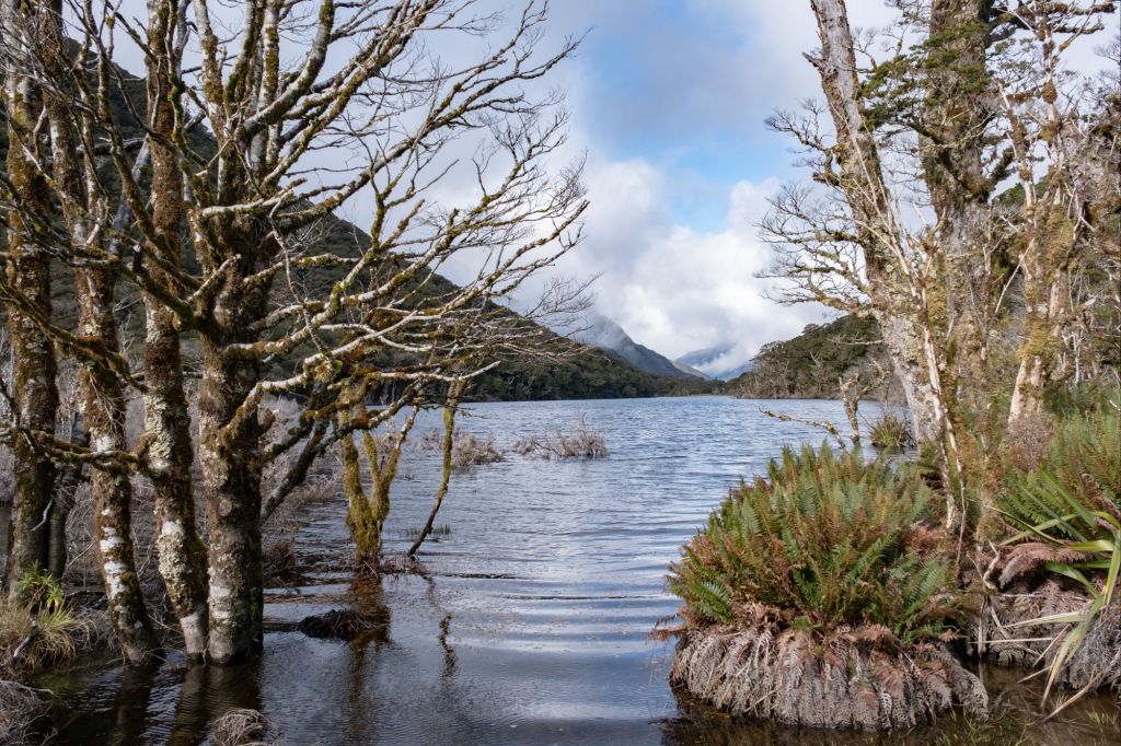 Comme le temps est un peu couvert ce matin, nous optons pour une petite randonnée vers le Key Summit. Dans la montée, nous nous arrêtons au Lake Howen, à l’ambiance inquiétante. L’eau est grise et de nombreux arbres moussus poussent les pieds dans l’eau, donnant un air désolé à l’endroit.