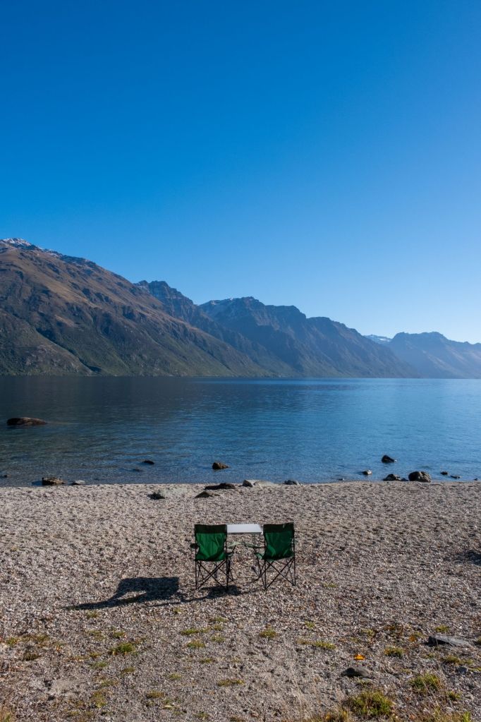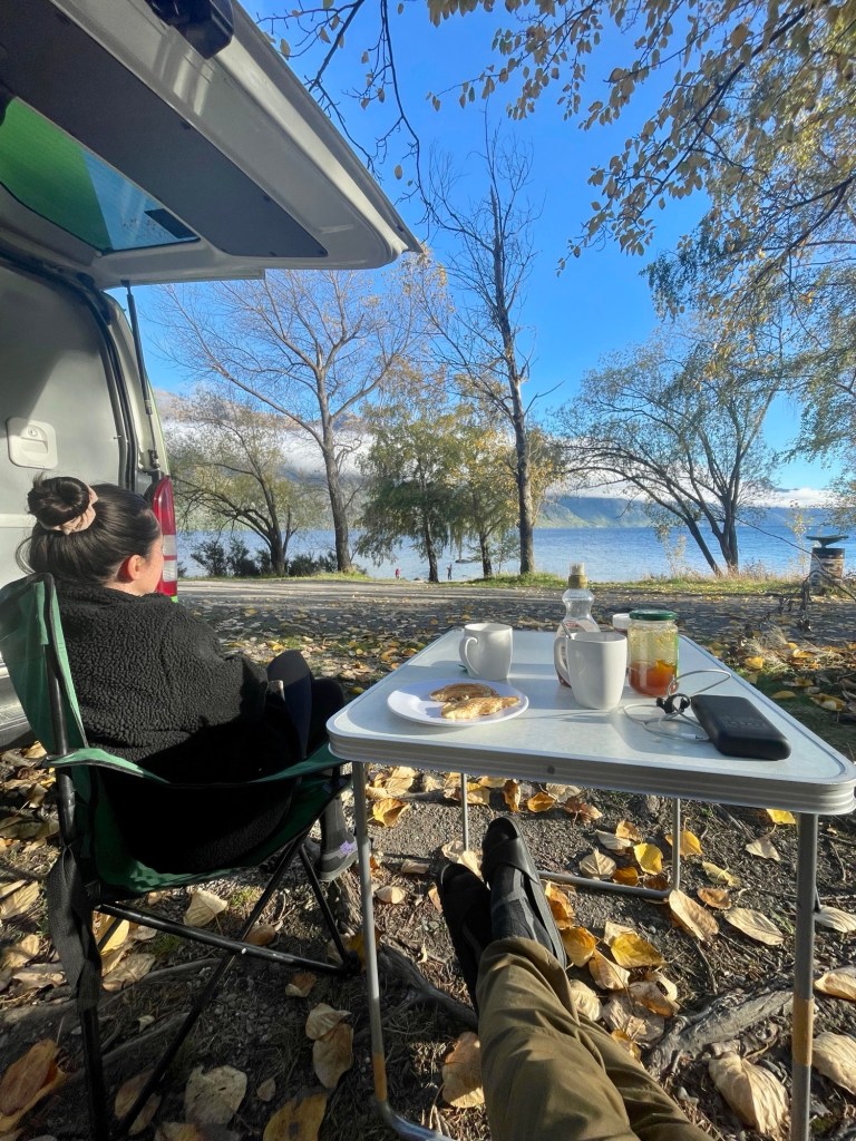 Après une grasse matinée bien méritée, nous nous réveillons devant le lac, sous un temps radieux. C’est magnifique, et nous en profitons pour installer notre table de petit-déjeuner sur la plage, avec la meilleure vue.