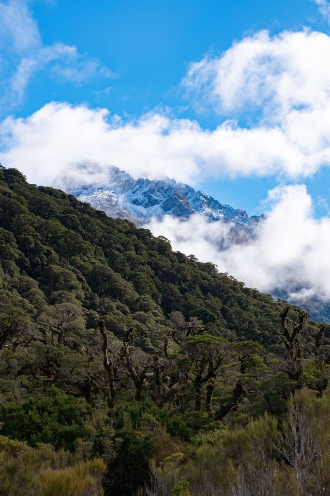 Nous poursuivons l’ascension et arrivons au sommet, où la vue se dégage sur les montagnes enneigées ainsi que sur le lac Marian (où nous étions hier), qui apparaît au loin entouré par les montagnes.
