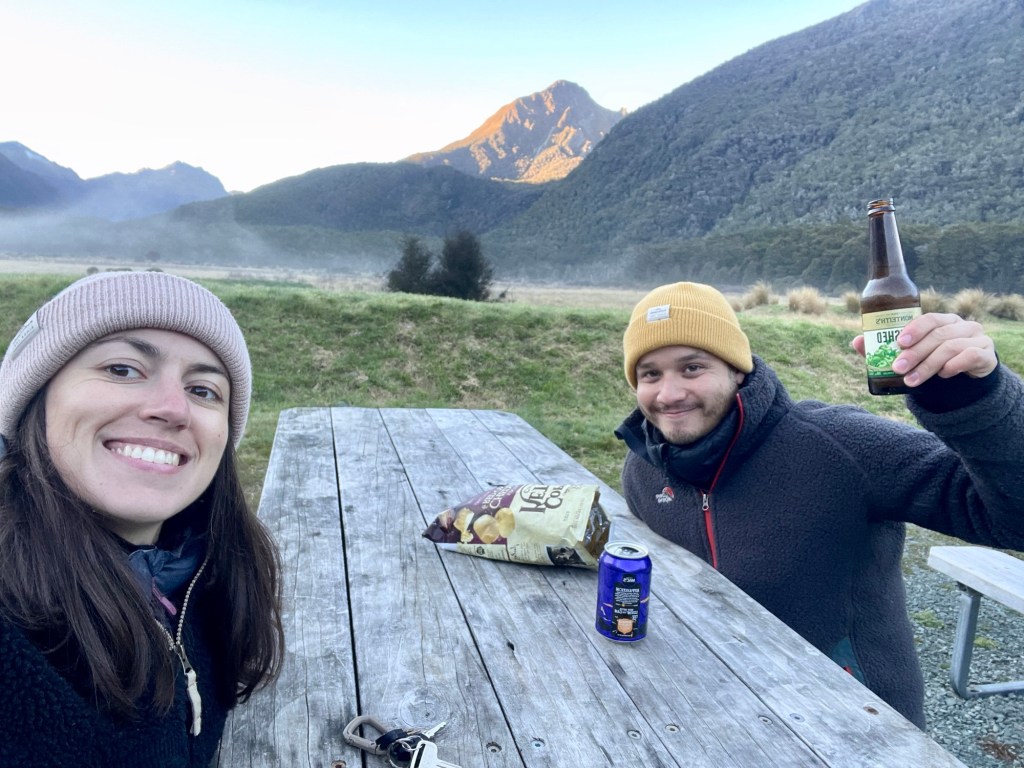 Sur la route du retour en direction de notre camping, nous rencontrons des keas, les seuls perroquets de montagne du monde, endémiques de Nouvelle-Zélande. Ils sont verts avec le dessous des ailes rouges, et un bec crochu. Ils sont apparemment très curieux et espiègles et n’hésitent pas à aller voler des objets ou s’approcher des humains. D’ailleurs, ils étaient posés sur une voiture arrêtée de notre file, et essayaient d’ouvrir la fenêtre !