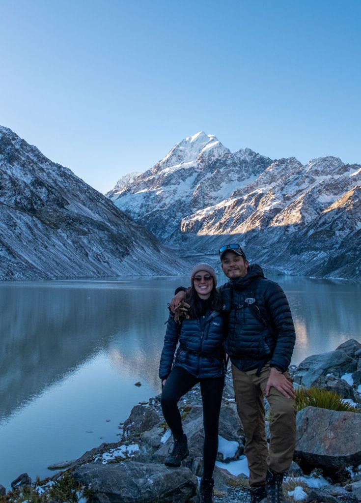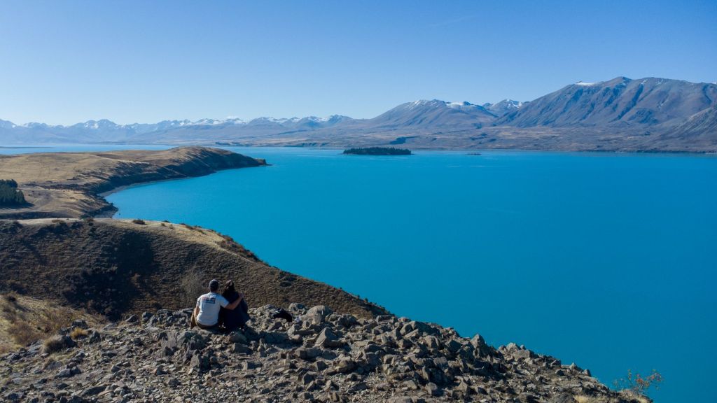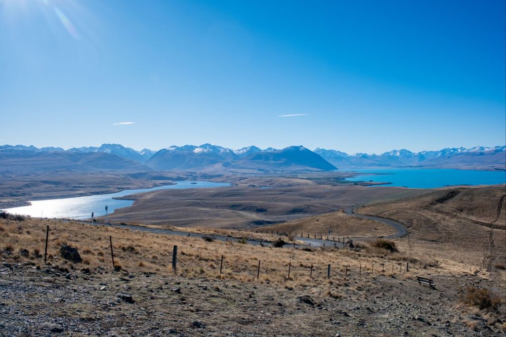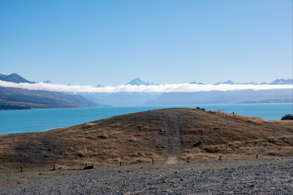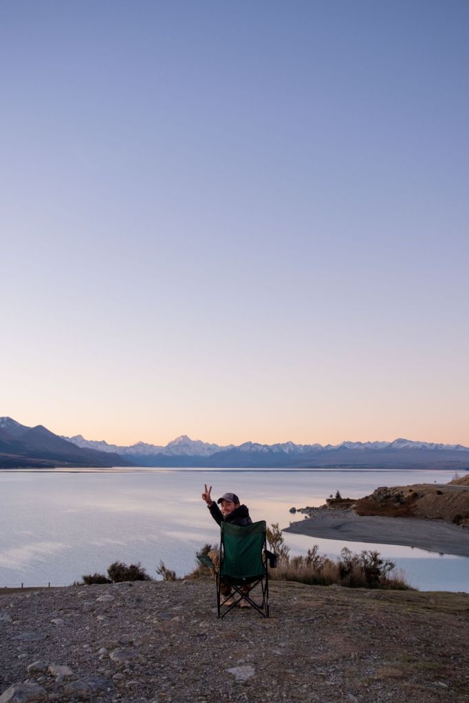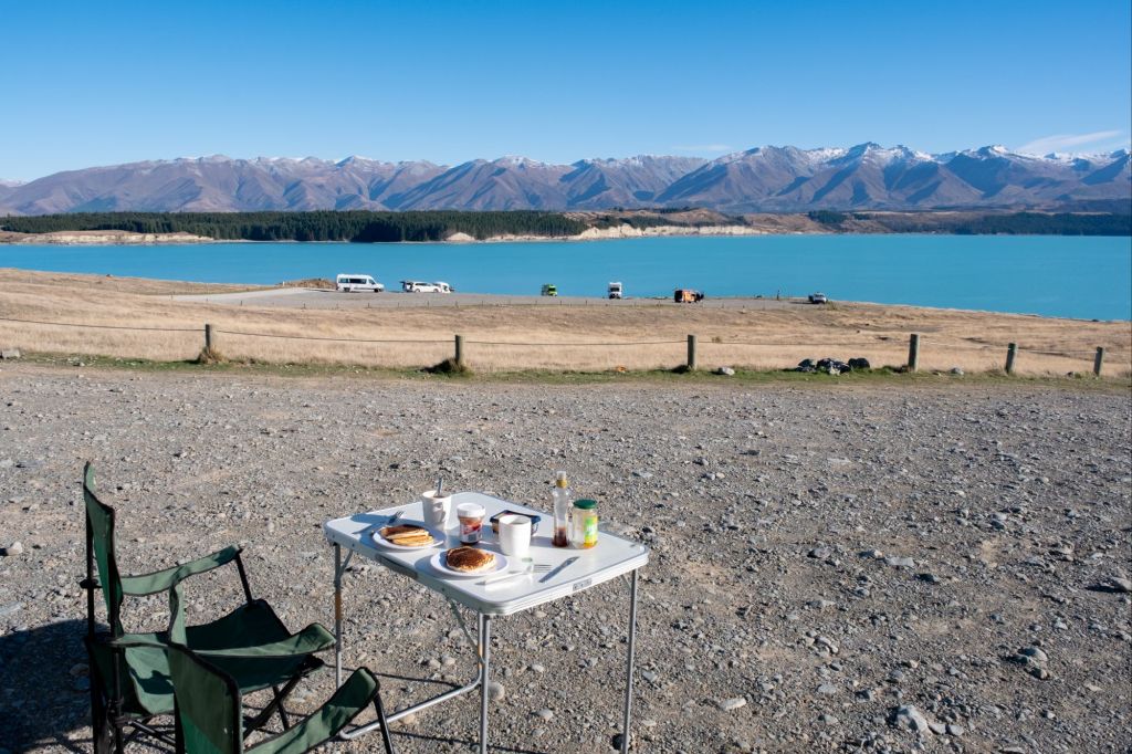 Nous nous réveillons avec la plus belle vue imaginable : face au lac Pukaki et sa magnifique couleur bleue, avec la silhouette enneigée du Mont Cook en arrière plan. Nous profitons du beau temps pour sortir notre table et prendre le petit-déjeuner dehors.