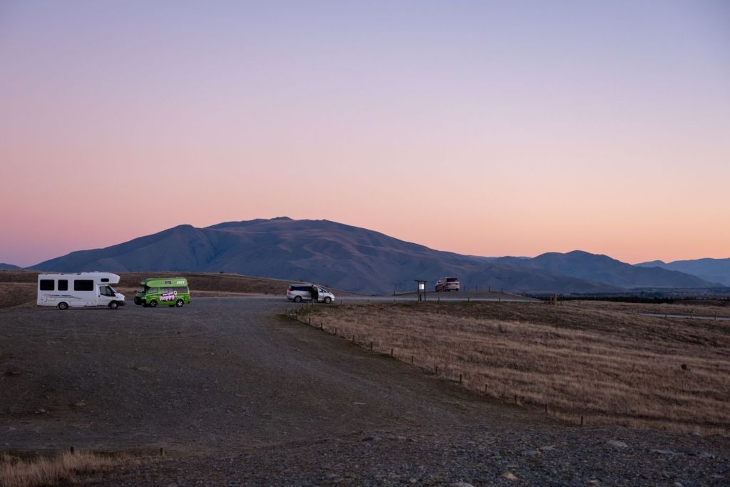 Nous retournons dormir à notre camp préféré au Lake Pukaki, et nous profitons du coucher de soleil sur la route panoramique au bord du lac, c’est magnifique.