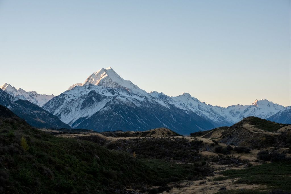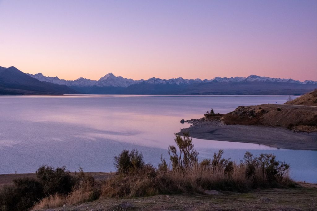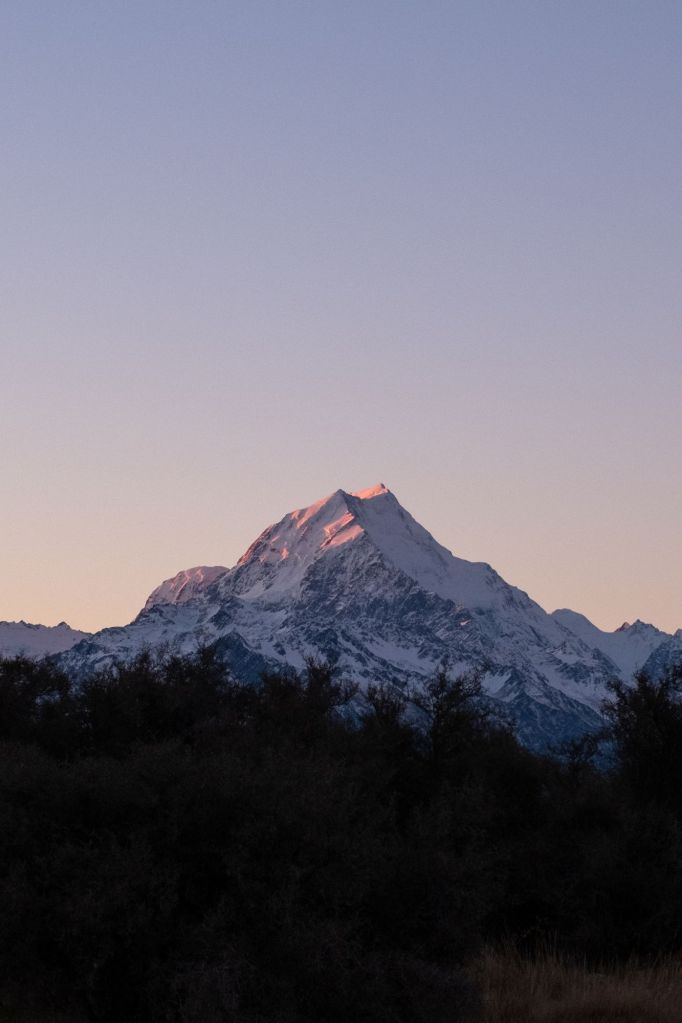 La vue est superbe, surtout quand les couleurs rosées du soir teintent le sommet du Mont Cook.