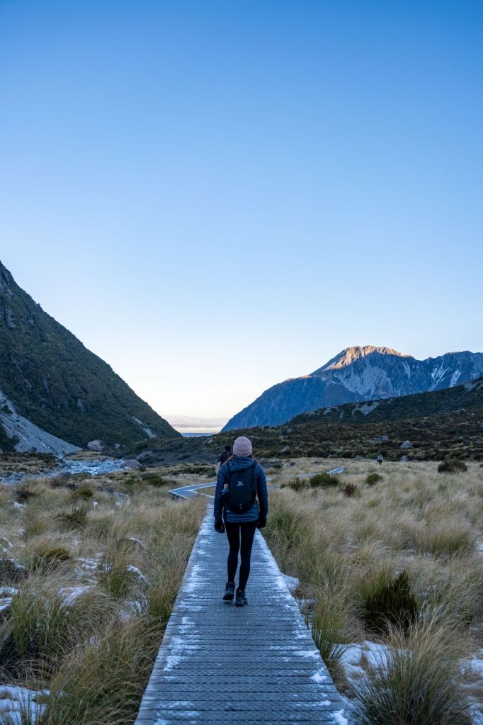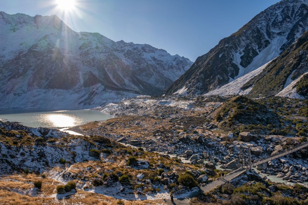 Hooker Valley Track (près du Mont Cook) ❤️ : jolie promenade de 10km à plat, avec petits ponts au-dessus des ruisseaux, et arrivée au Hooker Lake avec son glacier