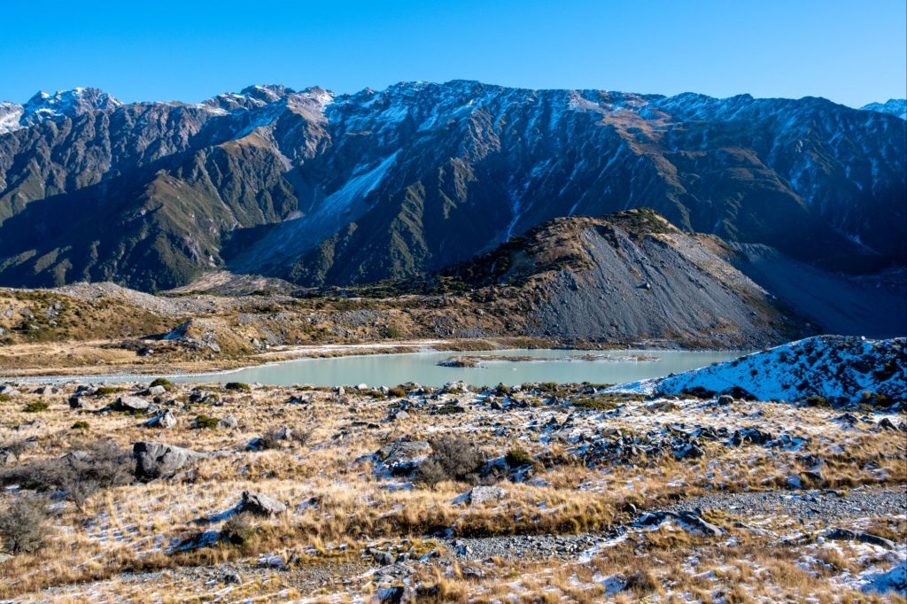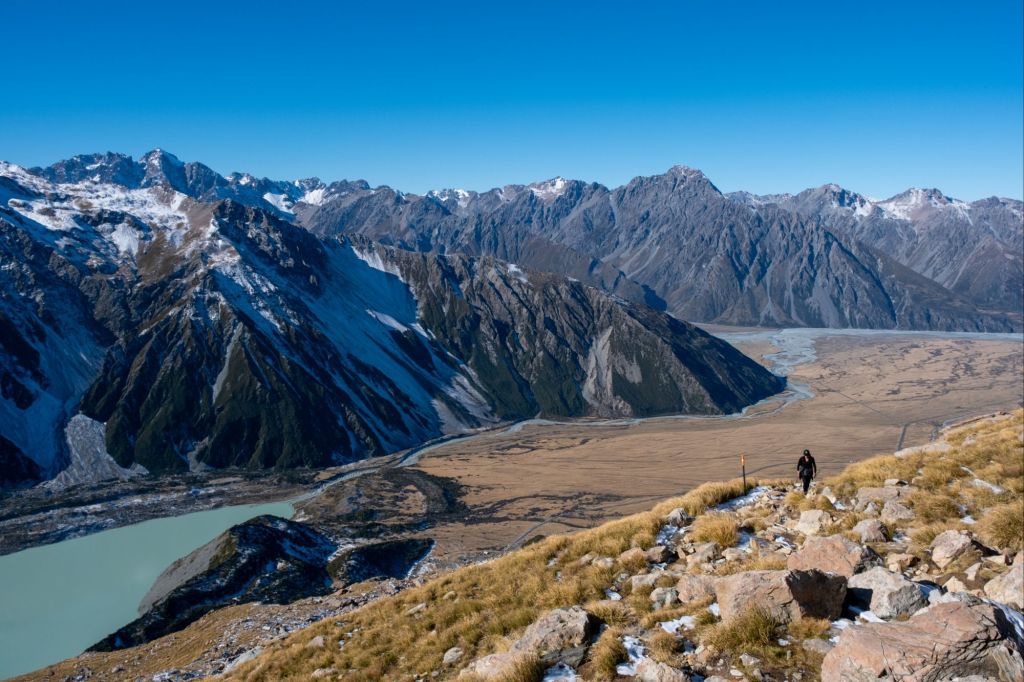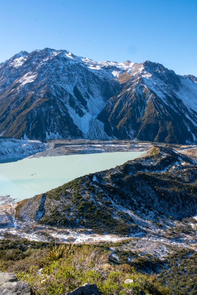 Puis nous commençons à grimper à flanc de montagne, au soleil, et le chemin est bien sec. La vue se révèle déjà, avec le Mueller Lake à nos pieds et la vue jusqu’au Hooker Lake et le Mont Cook juste derrière. C’est magnifique.