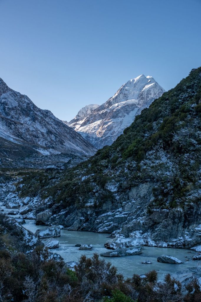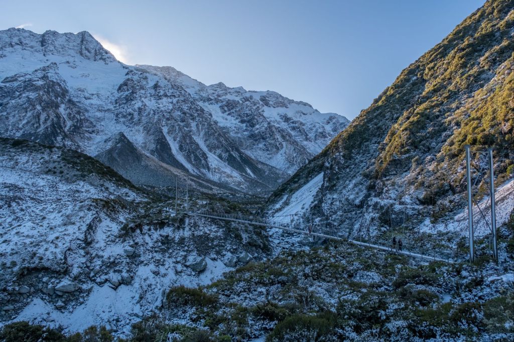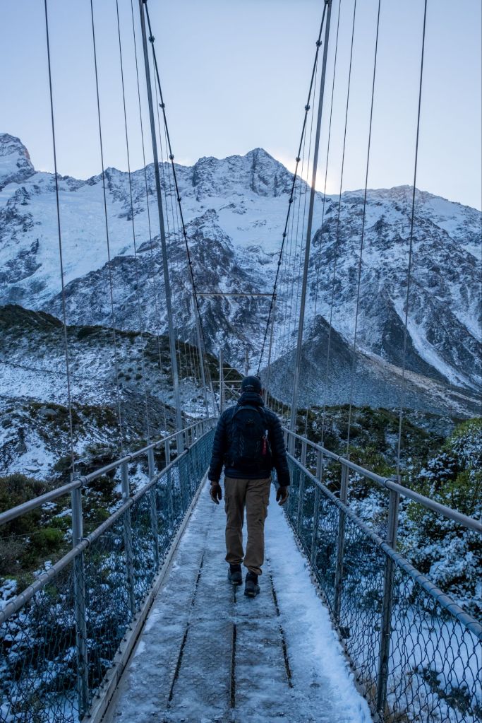 Nous longeons le lac Pukaki en direction du mont Cook. La neige est bien tombée cette nuit, et nous décidons d’attendre demain pour faire notre grosse randonnée, avec l’espoir qu’elle fonde un peu. Nous faisons juste une petite marche de 10km, à plat, sur la Hooker Valley track. Le sentier est bien aménagé, et de nombreux ponts suspendus traversent les rivières qui descendent du glacier.