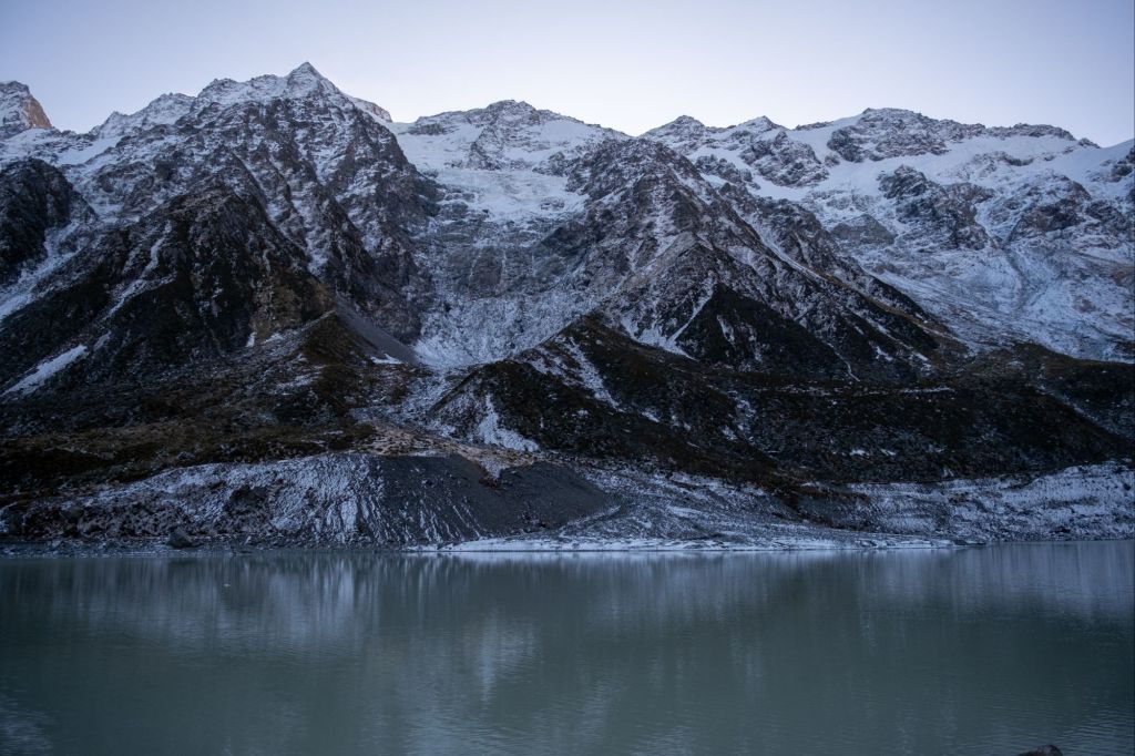 Arrivés au fond de la vallée, nous avons vue sur le lac Hooker, à l’eau grise avec quelques blocs de glace qui y flottent, le glacier Hooker qui a les pieds dans le lac, et la majestueux Mont Cook qui les surplombe.