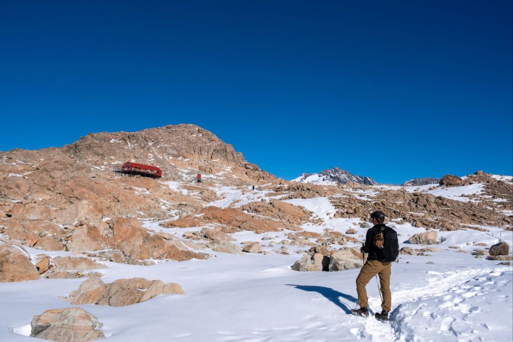 La montée s’intensifie et est de plus en plus raide. Plus nous grimpons et plus la neige est présente. Un petit passage difficile dans un pierrier glacé, et l’arrivée à la hutte se fait au milieu des rochers dans la neige fraîche.