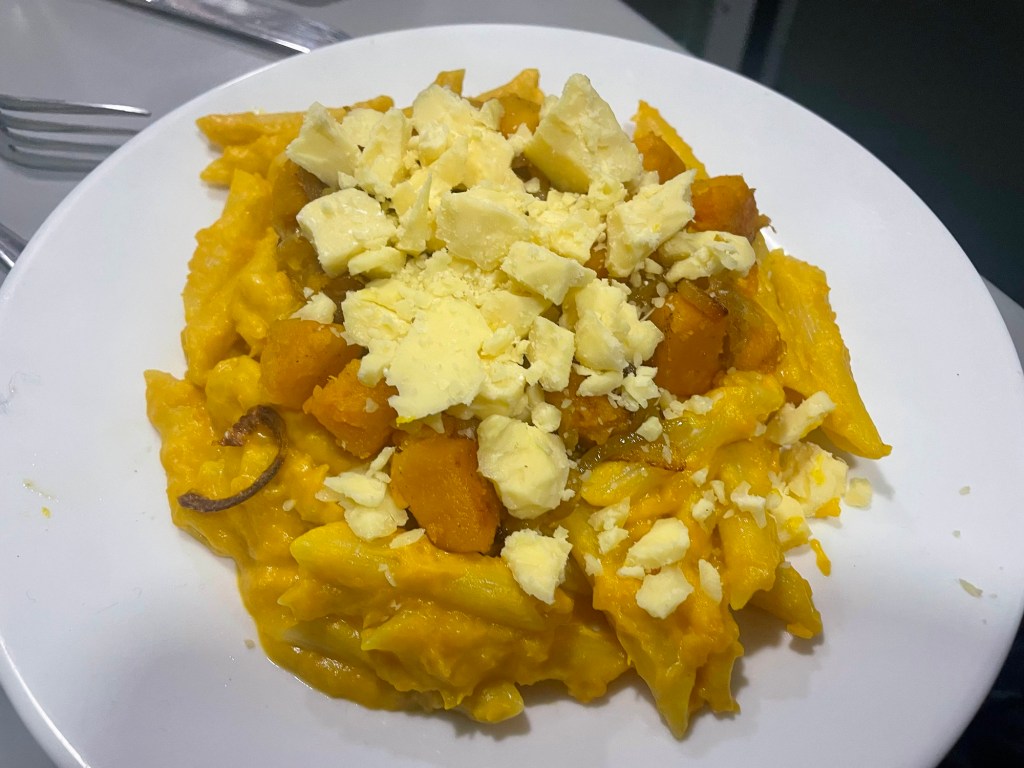 Pour le dîner, nous mangeons des pâtes à la courge et au fromage (le fameux cheddar tasty en bloc d’1kg dont nous avons une grande consommation depuis le début du road trip).