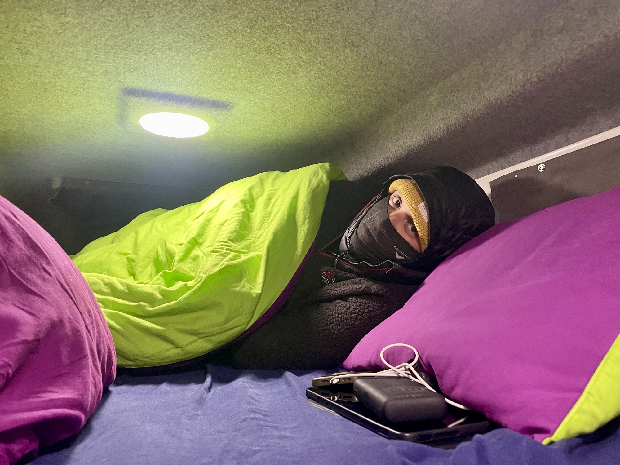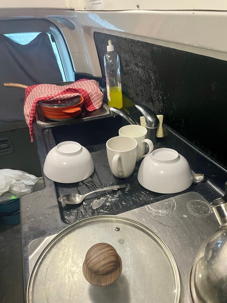 Ce matin nous nous réveillons dans un van absolument glacial. Nous avions laissé la vaisselle s’égoutter dans la cuisine, elle est collée dans sa flaque d’eau gelée, et le torchon est glacé aussi… Nos canalisations d’eau ont gelé, et le gaz ne marche plus à cause du froid.