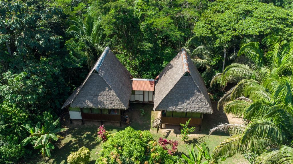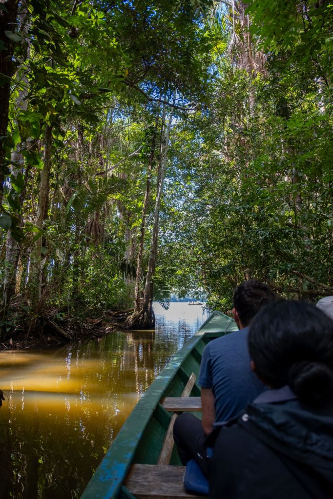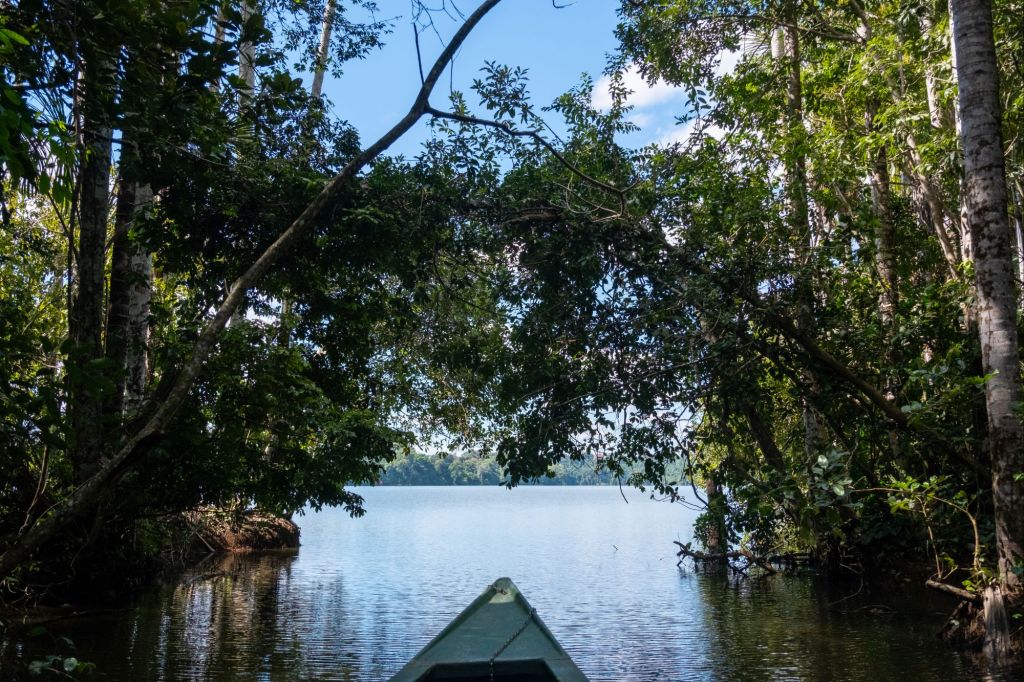 Nous nous rendons à notre agence Tambopata Rainforrest Tours, qui s’occupera de nous pendant les 3 prochains jours. Nous commençons par faire 40 minutes de bateau jusqu’à notre lodge dans la forêt. La maison principale est très jolie, toute en bois, et il y a des bungalows répartis dans le jardin, au milieu des palmiers et autres plantes tropicales.