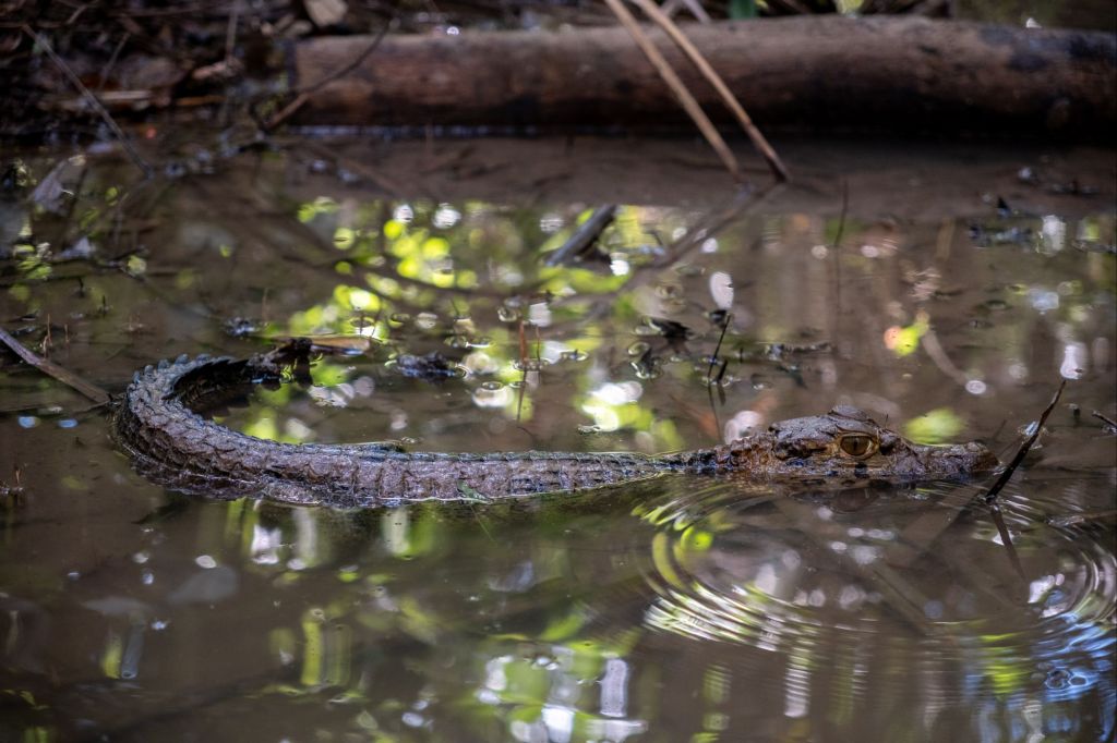 Sitôt arrivés, nous repartons déjà pour notre première excursion au Lac Sandoval. Nous marchons quelques kilomètres sur un petit ponton de bois au milieu de la forêt, jusqu’à arriver à un minuscule port où sont amarrées quelques barques. Nous grimpons à bord et empruntons un petit ruisseau qui amène au lac. Nous y voyons quelques petits caïmans sur le chemin.