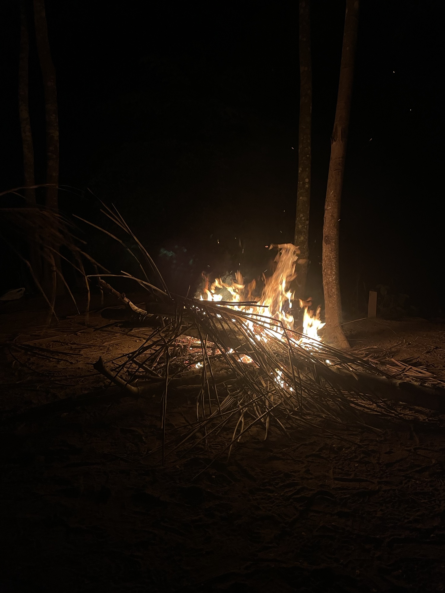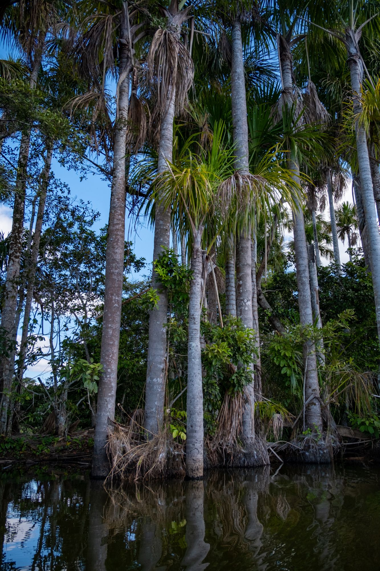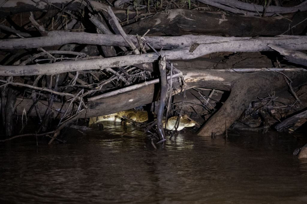 Une fois la nuit tombée, nous partons en bateau à la recherche de caïmans sur le rio. Nous en voyons plusieurs, à demi immergés, leurs yeux brillent dans la lumière de nos lampes. Nous en voyons même un en train de manger un gros rongeur, sur la berge. Le ciel est complètement dégagé et les étoiles sont magnifiques, on peut même voir la Voie Lactée.