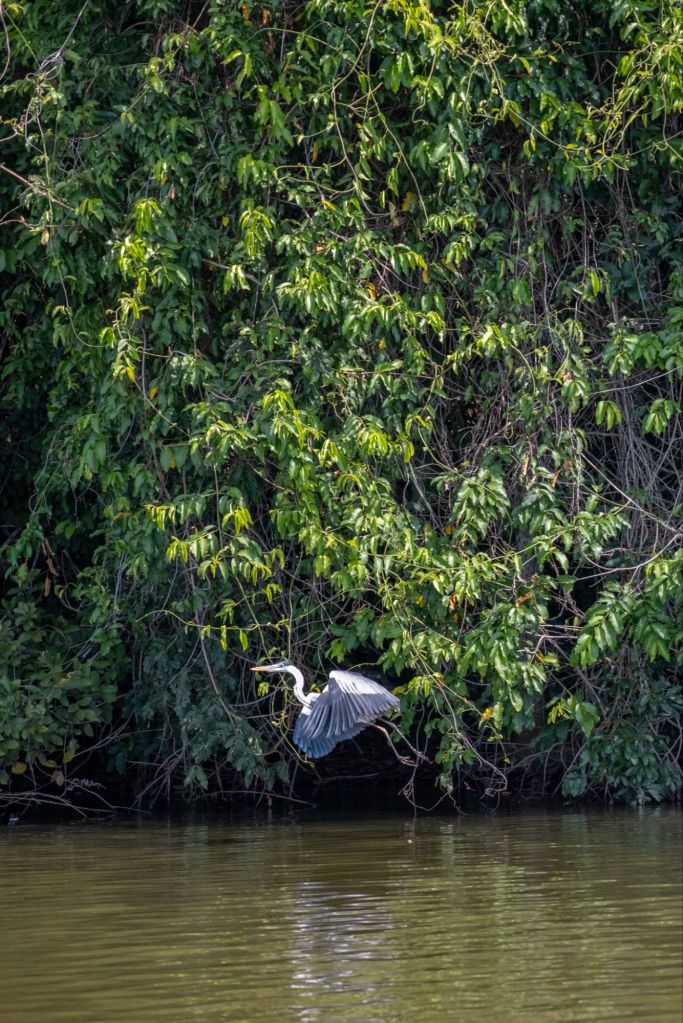 Puis nous rencontrons de nombreux oiseaux sur les bords du lac : ibis vert, héron et quelques magnifiques aras jaune et bleu.