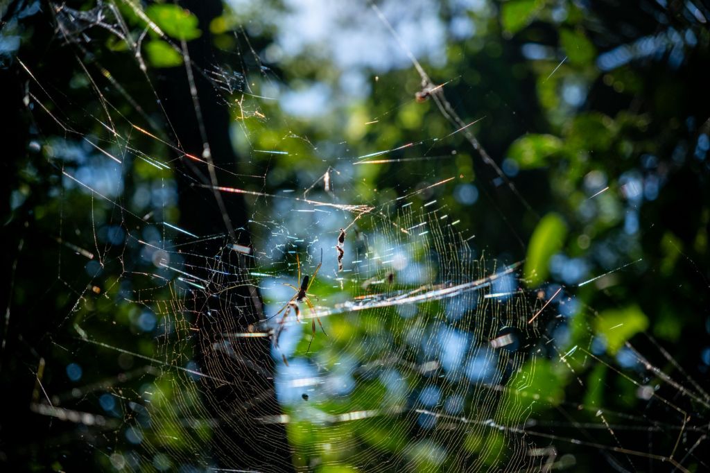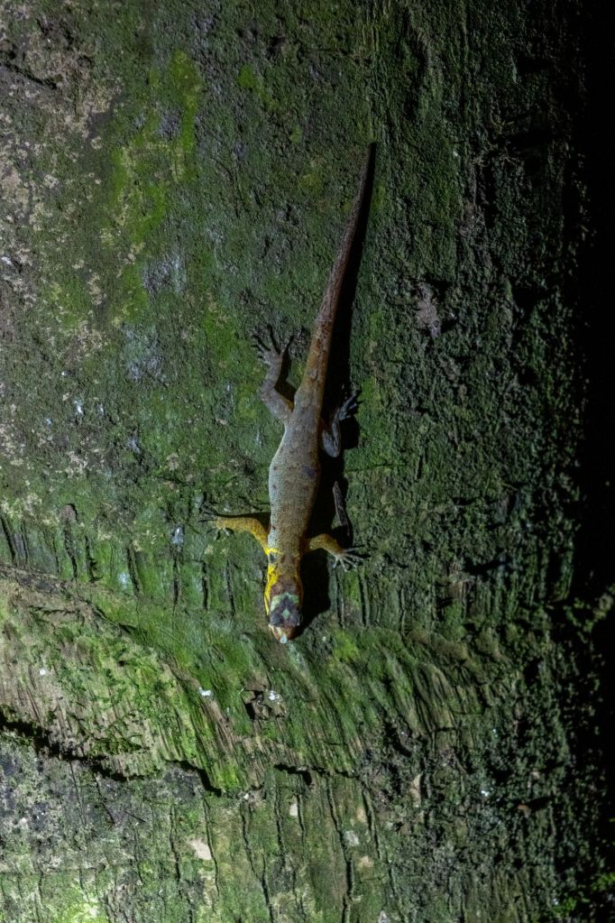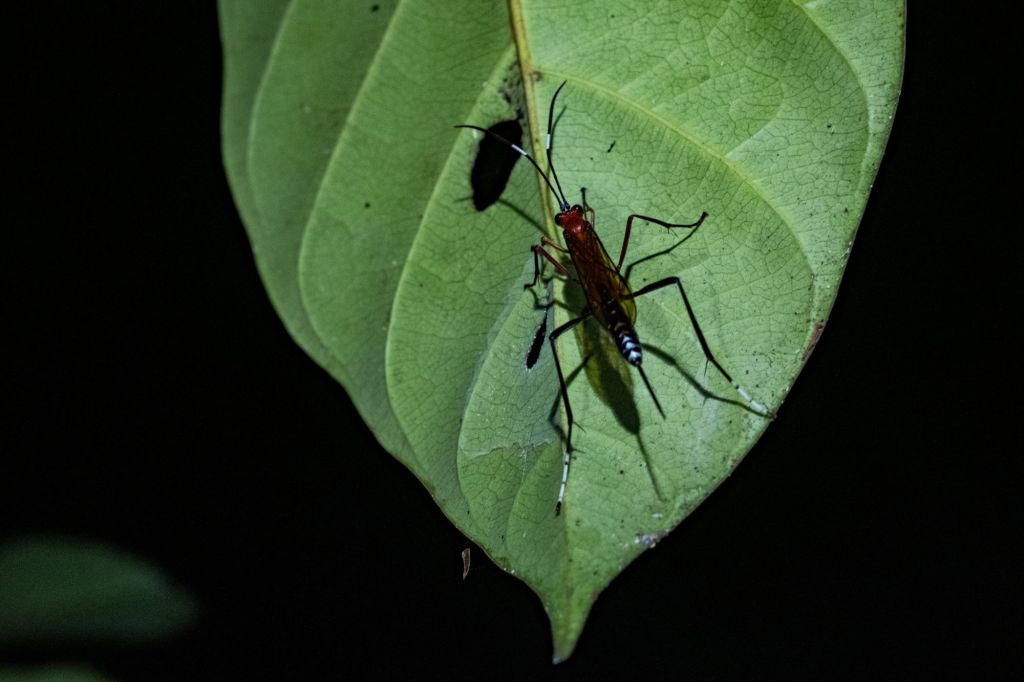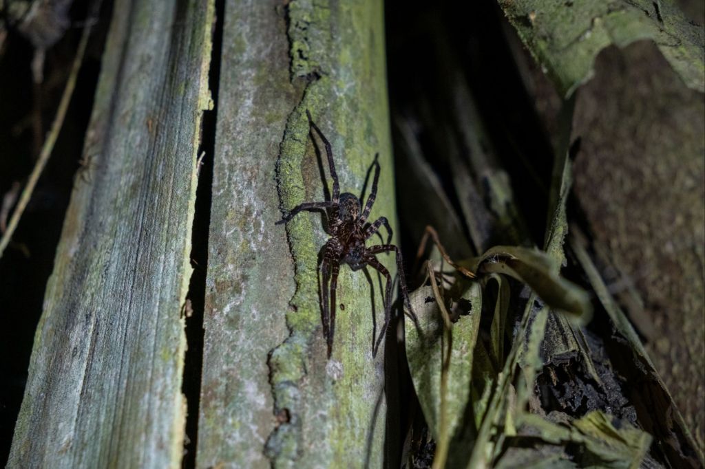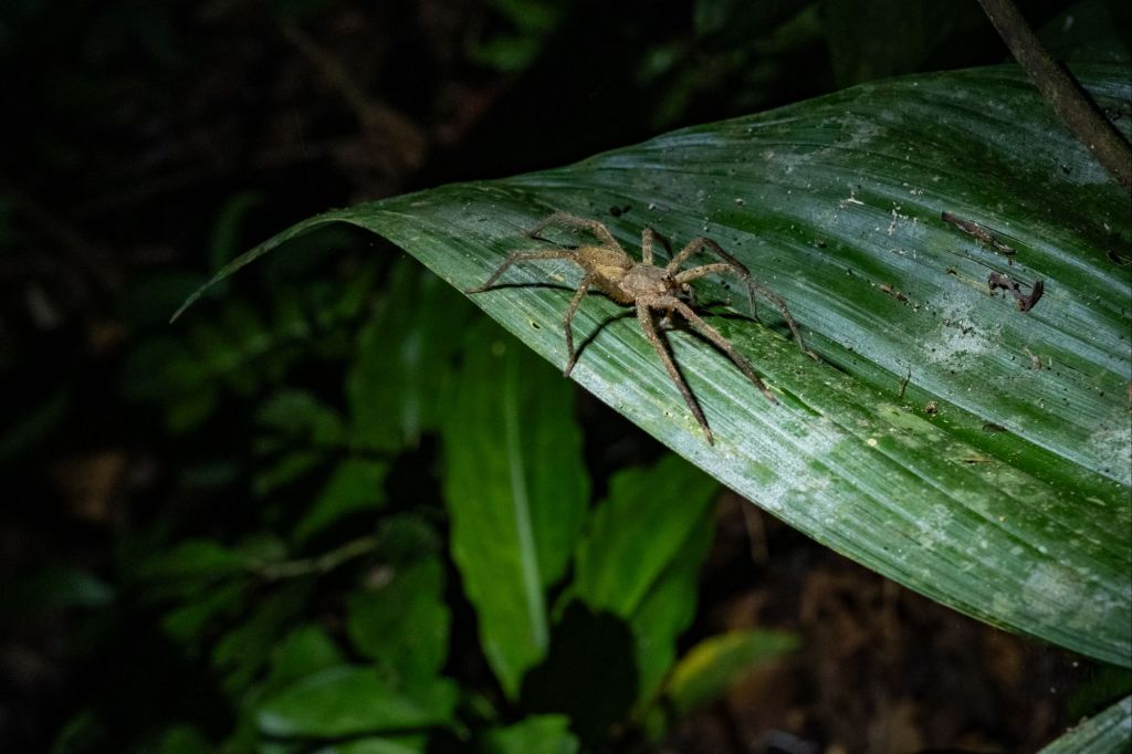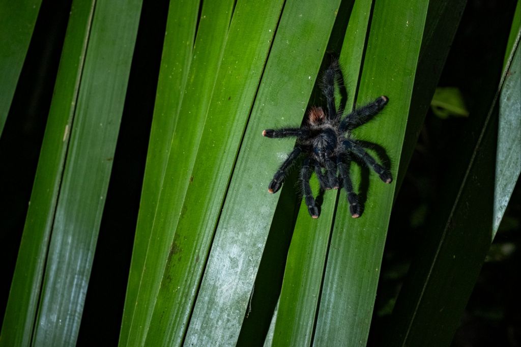 Notre sortie nocturne est pleine de vie : nous trouvons de nombreuses araignées (beaucoup de belles tarentules poilues), et un joli criquet en forme de feuille.