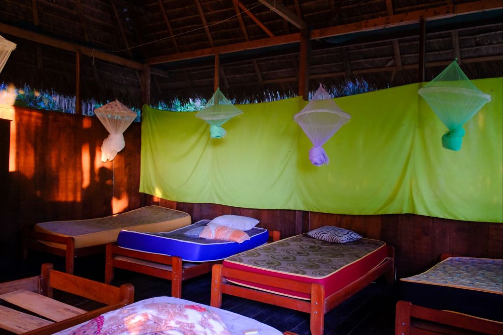 À Puerto Maldonado nous logeons au Libélula hospedaje, une jolie auberge à l’architecture incongrue, bâtie dans un hangar, avec une jolie salle commune.